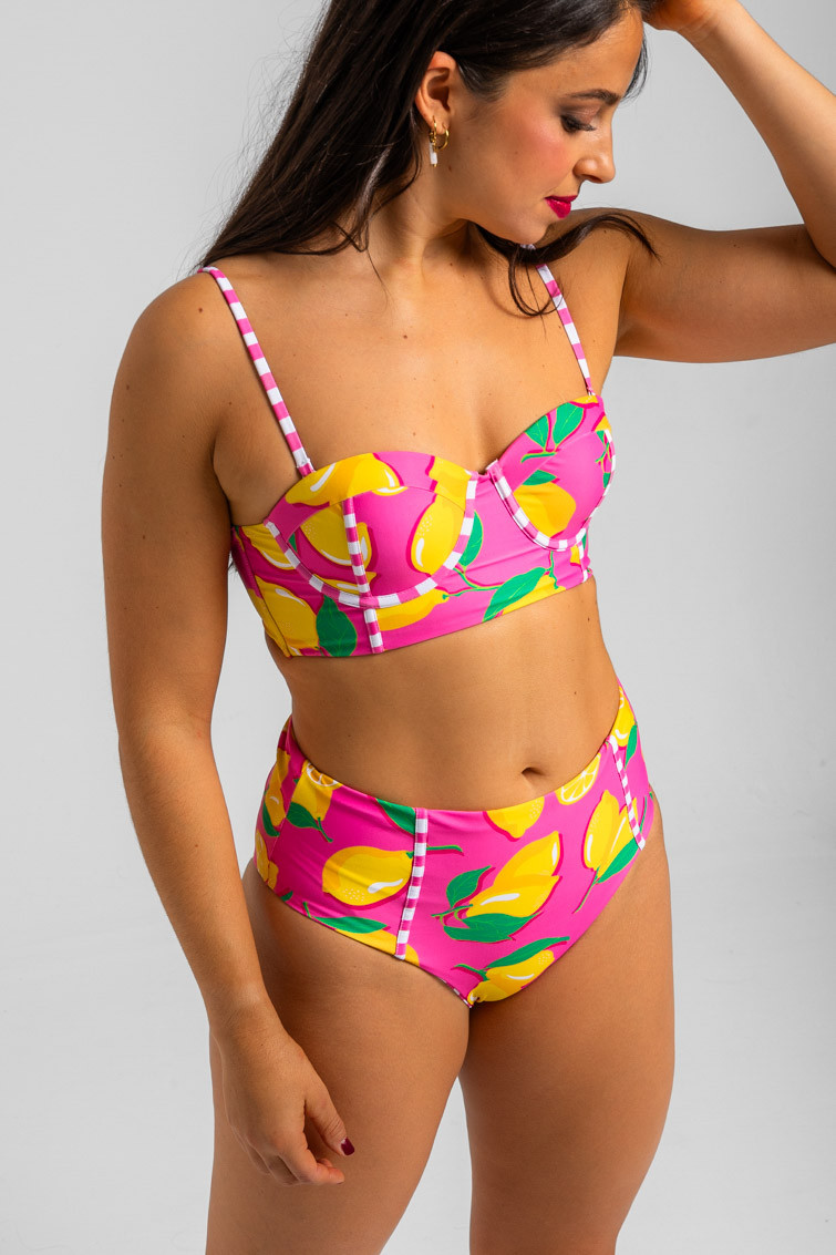 Bikini compuesto de dos piezas. La braguita es de talle alto con parte trasera semicubriente y despiece con detalle de cenefa en cintura. Forrada. Top de bikini balconet con copas acolchadas que realzan y moldean el busto. Tirantes ajustables de quita y pon y cierre en la espalda. Forrado. Con aros
