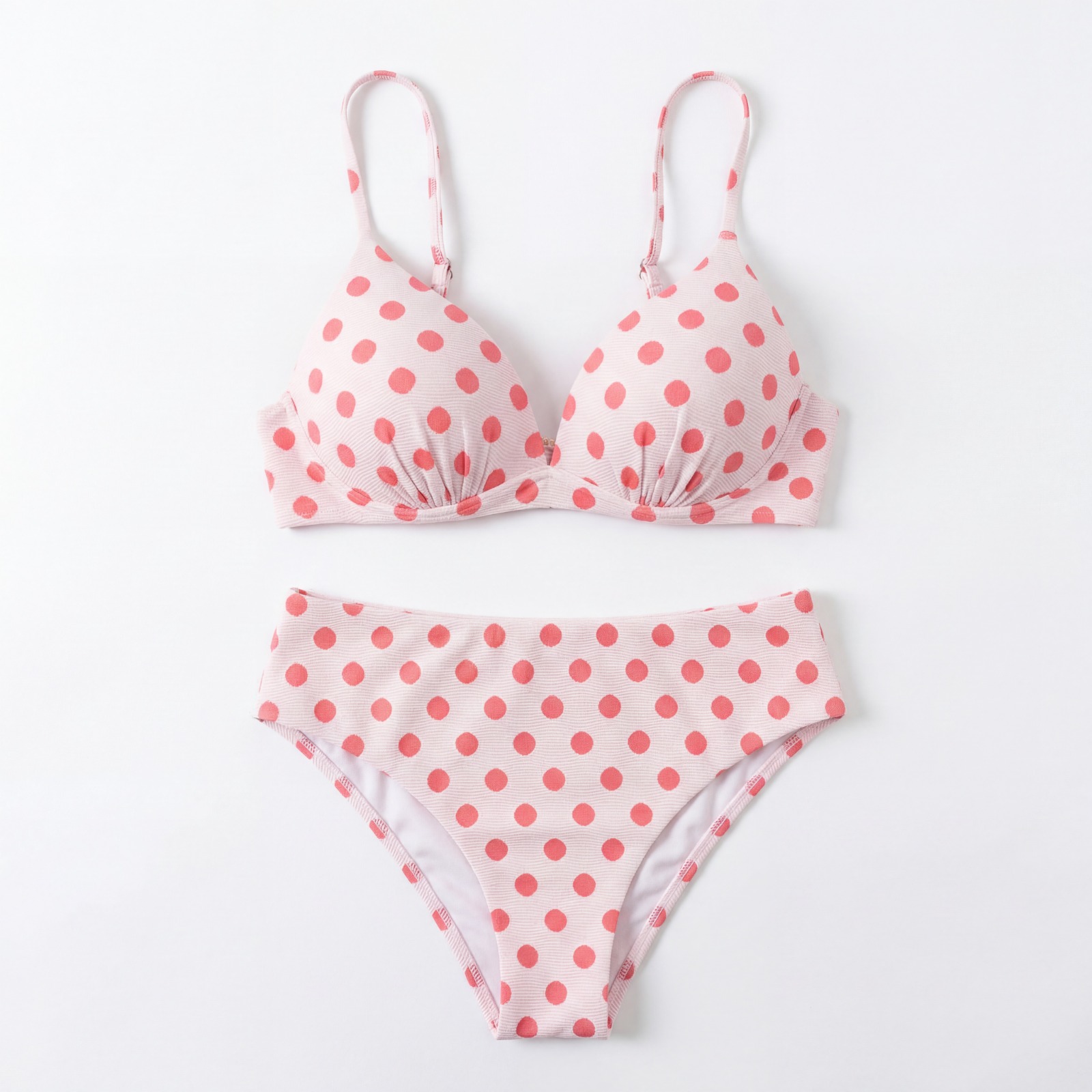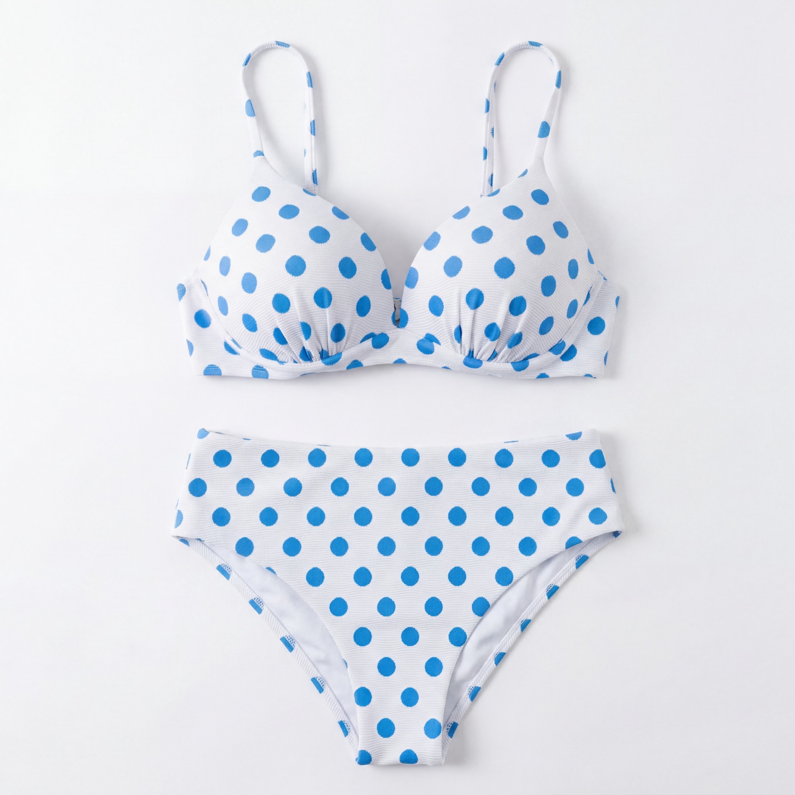 Bikini de lunares compuesto por un top con aros y incluye tirantes finos ajustables y cierre con broche en la espalda.