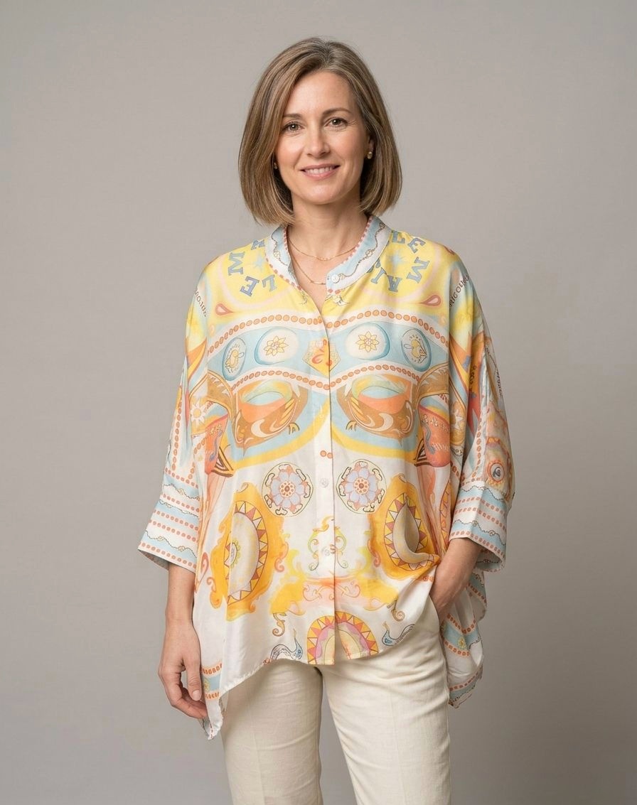 Blusa de corte oversize, cuello mao, abotonada.