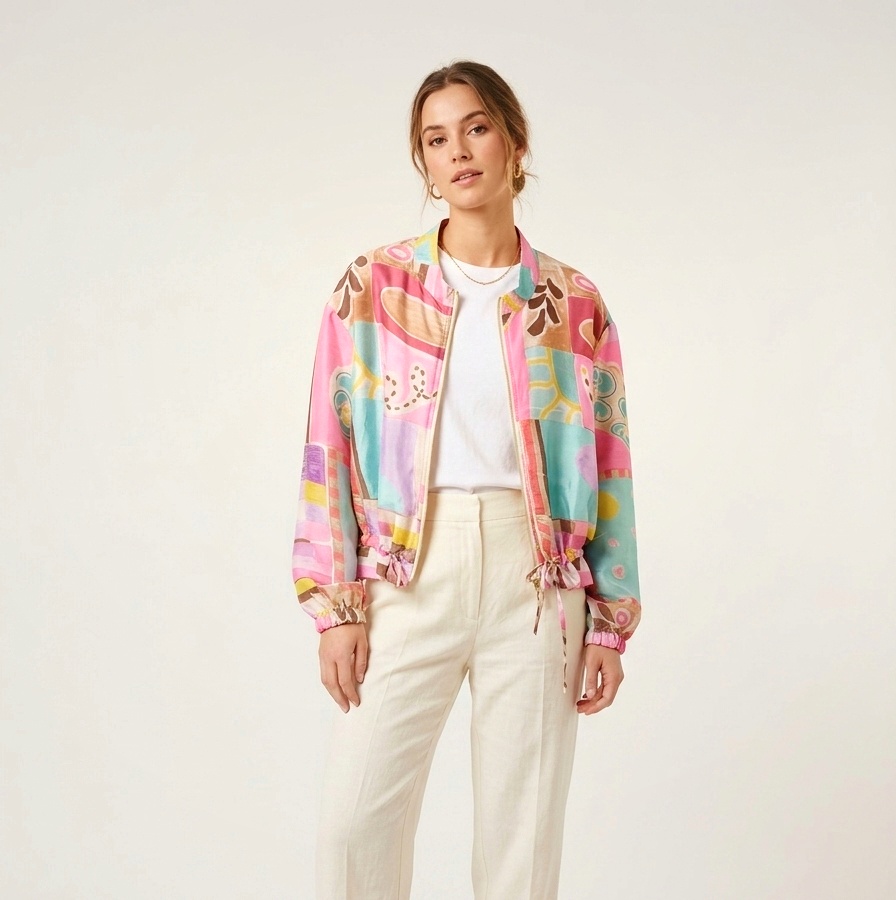 Cazadora bomber con un diseño estilo patchwork asbtracto y multicolor.