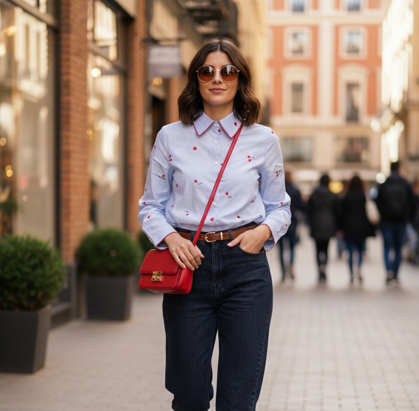 Camisa de algodón de corte clásico con bordados integral pequeños de cerezas y corazones.