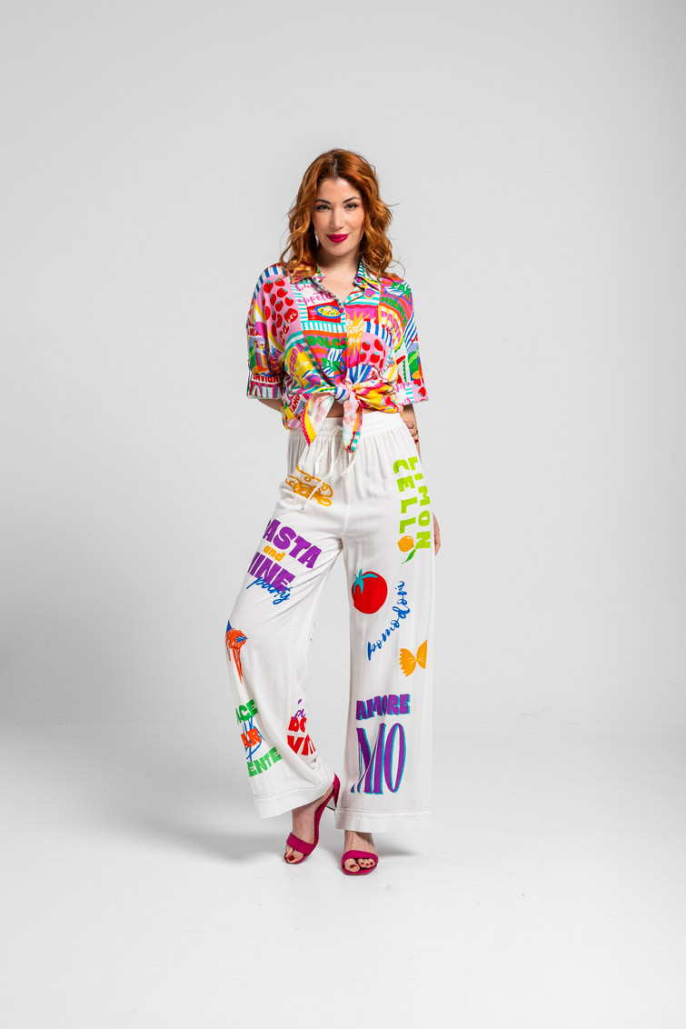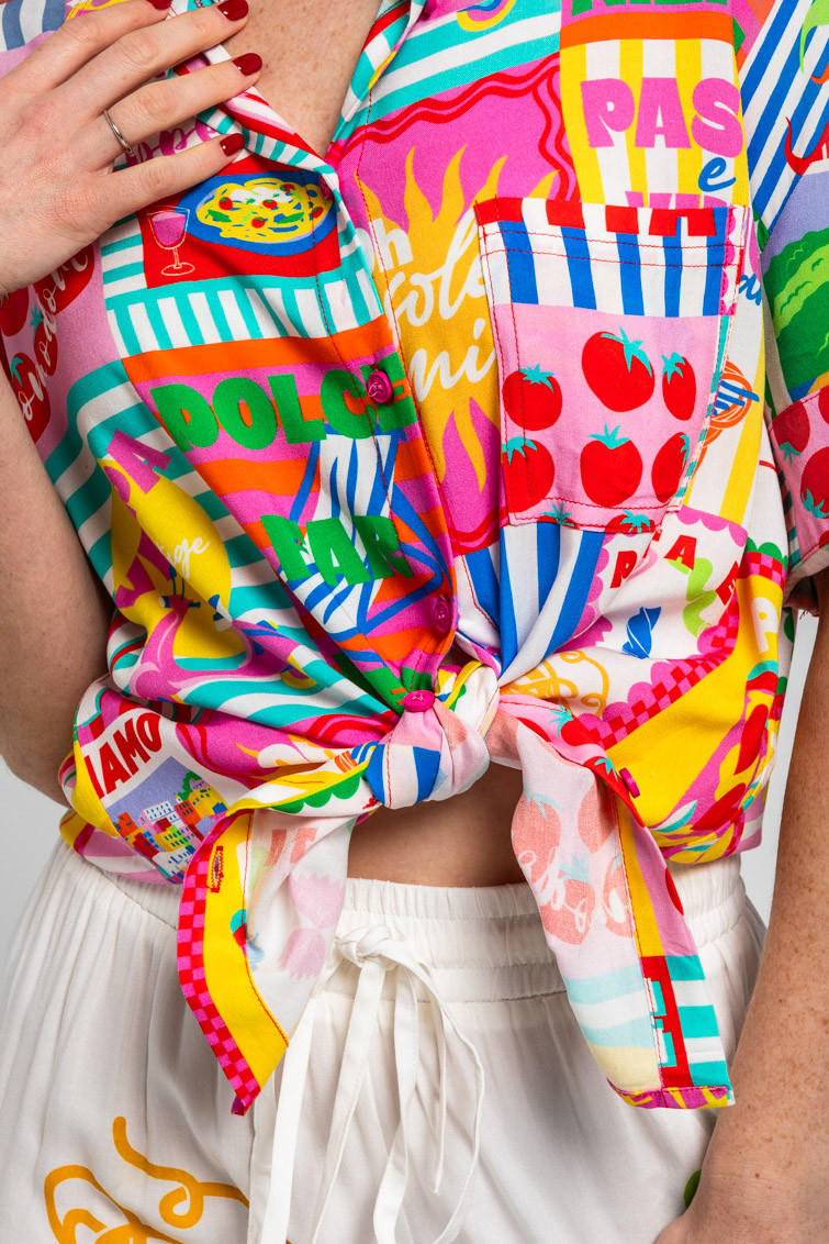 Camisa safari de estampado collage italiano: Camisa de tela ligera. Cuello de camisa en pico. Cierre frontal con botones. Manga corta vuelta. – 100% Viscosa.