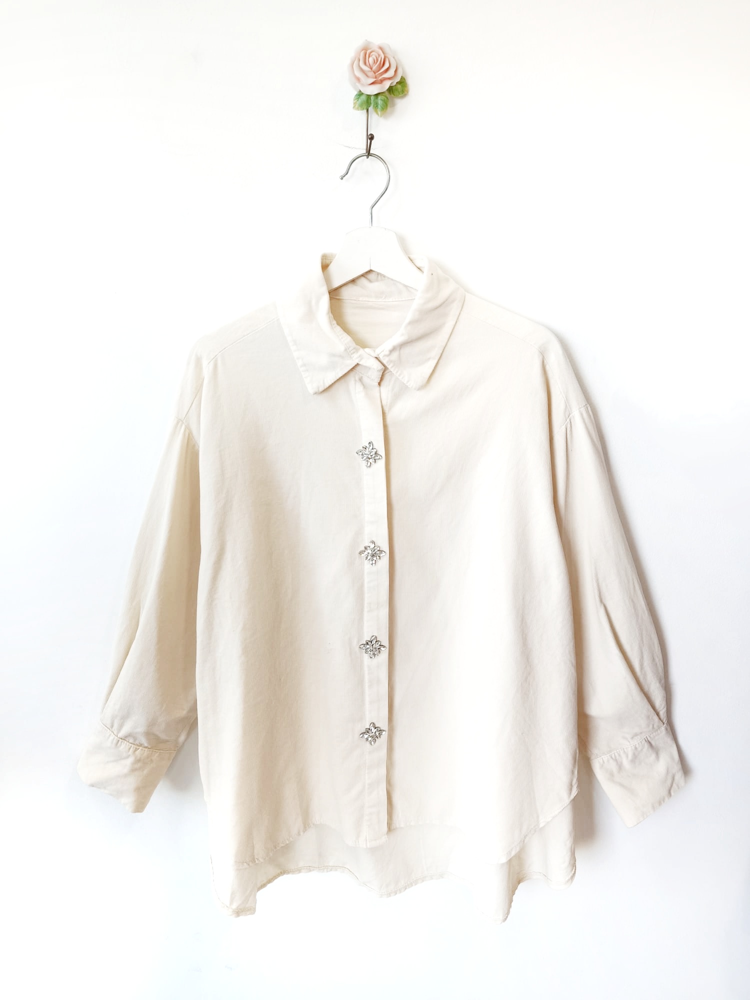 Camisa oversize de micropana fina. Tejido ligero. Doble botonadura, botón joya, manga larga.  La camisa es más larga por la parte trasera.