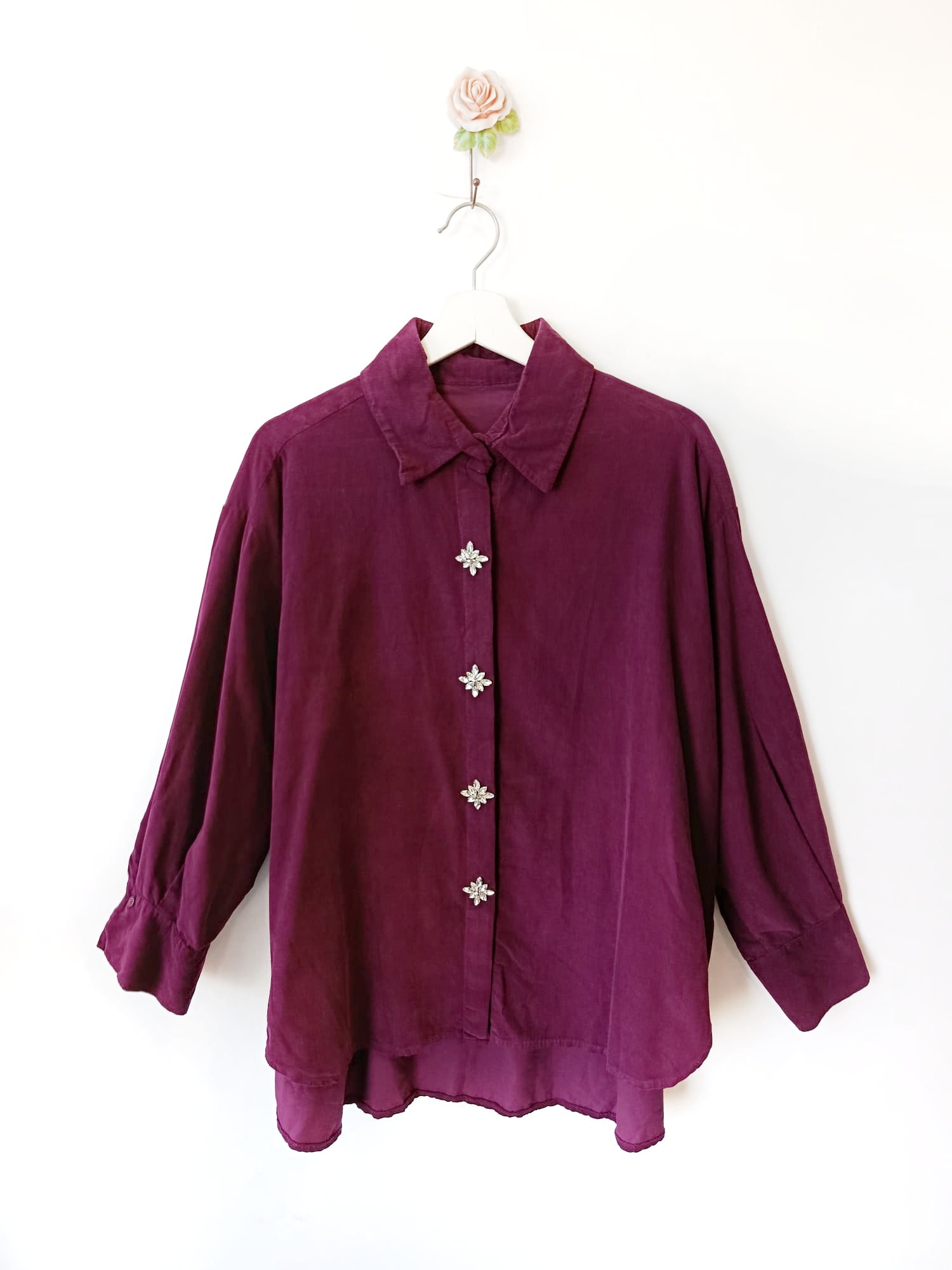 Camisa oversize de micropana fina. Tejido ligero. Doble botonadura, botón joya, manga larga.  La camisa es más larga por la parte trasera.
