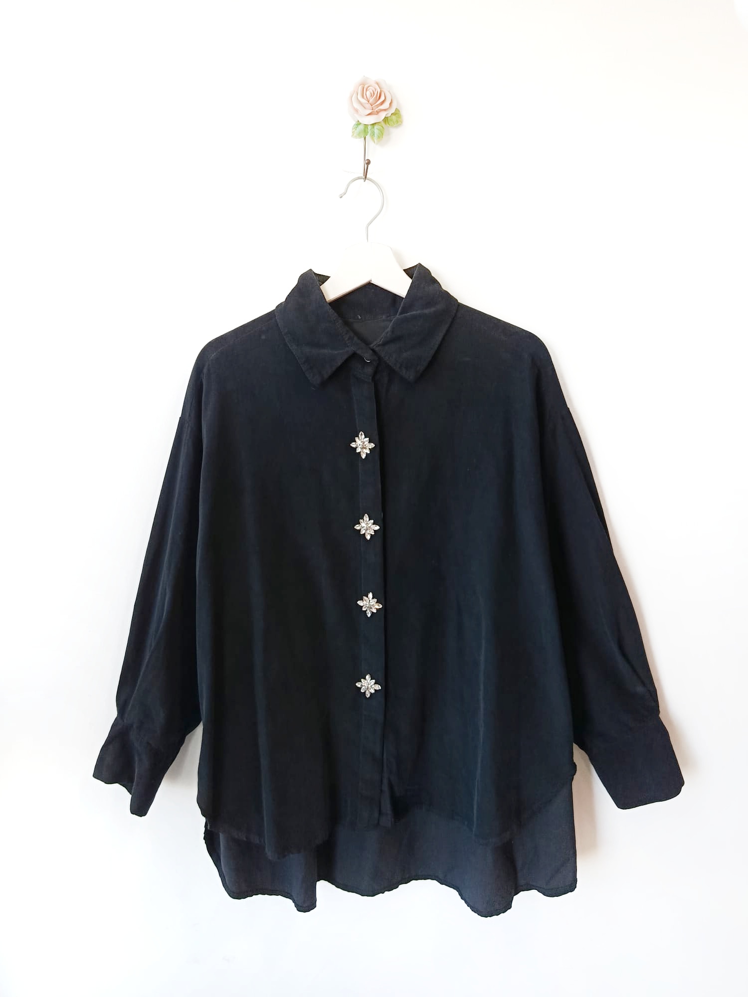 Camisa oversize de micropana fina. Tejido ligero. Doble botonadura, botón joya, manga larga.  La camisa es más larga por la parte trasera.