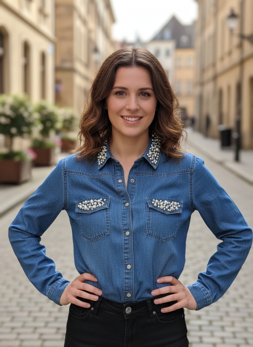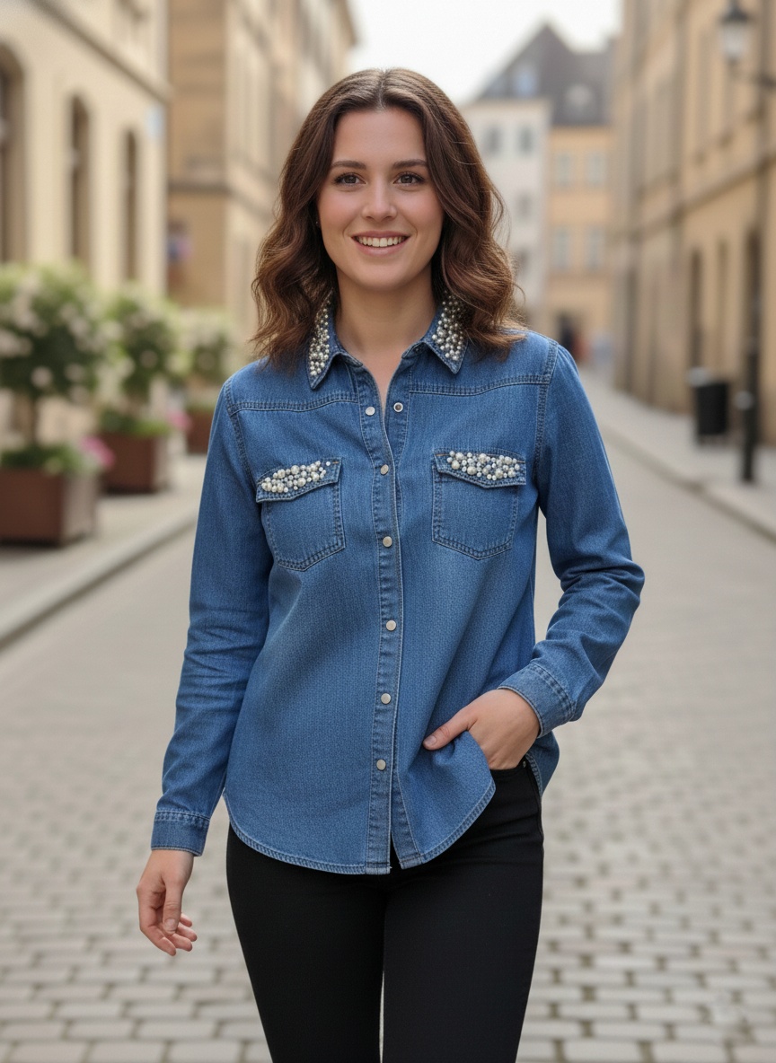 Camisa vaquera con el detalle de perlas en el cuello y en las solapas de delante.