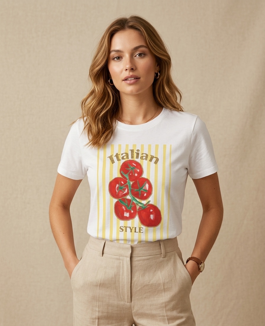 La camiseta lleva la impresión digital de tomates y líneas de colores.