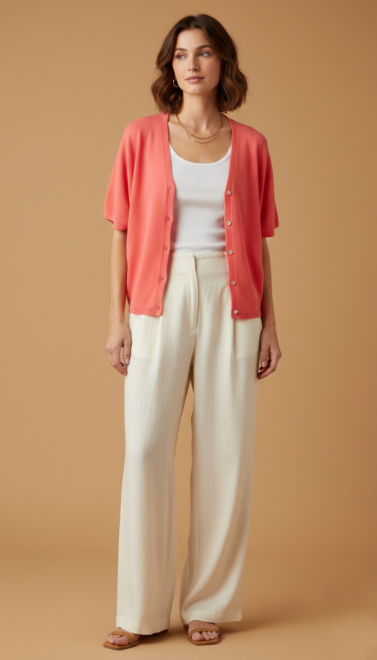 Chaqueta estilo cárdigan, con el escote en V. Tiene cierre frontal de botones pequeños y discretos.