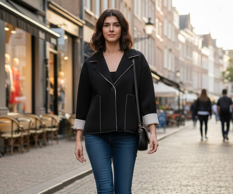 La chaqueta tiene solapas y dos bolsillos frontales.