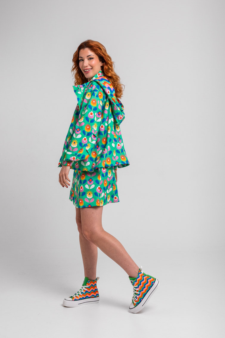 Chaqueta capucha verde de flores: Chaqueta de estampado vectorial con cuello elevado, capucha ajustable con cordón y botón. Bolsillos delanteros con solapa y botón de presión, y elástico revestido en los puños. Forrada.