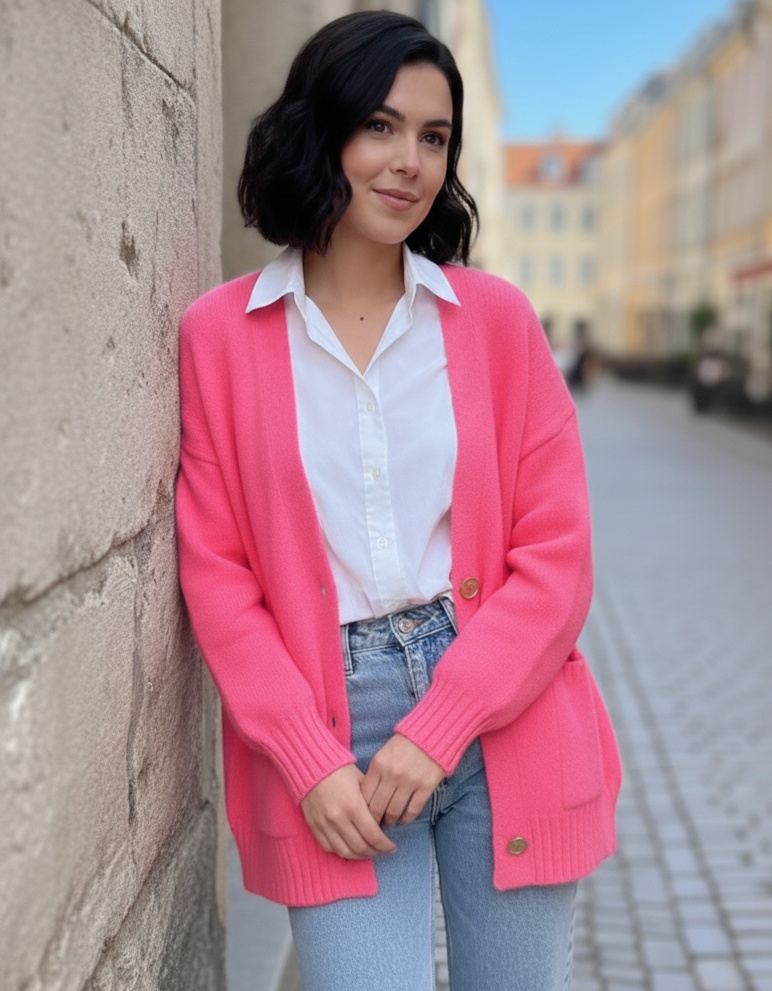 Chaqueta de punto de jersey, con bolsillos en la parte delantera y botones en dorado como cierre.