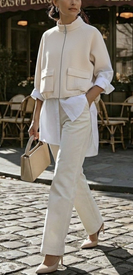 Chaqueta de estilo bomber en color crema, lleva dos bolsillos en la parte de delante y cremallera.
