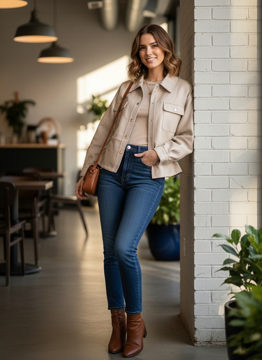 Cazadora corta de polipiel en color beige con el cinturón a conjunto.