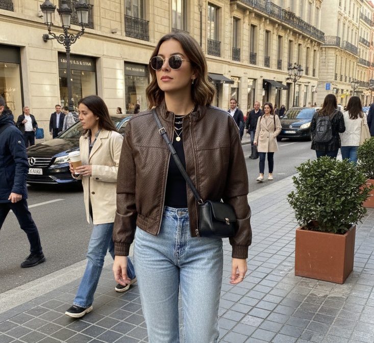 Cazadora de polipiel estilo bomber, el cuello mao le da un toque más moderno. Lleva goma en la parte inferior.