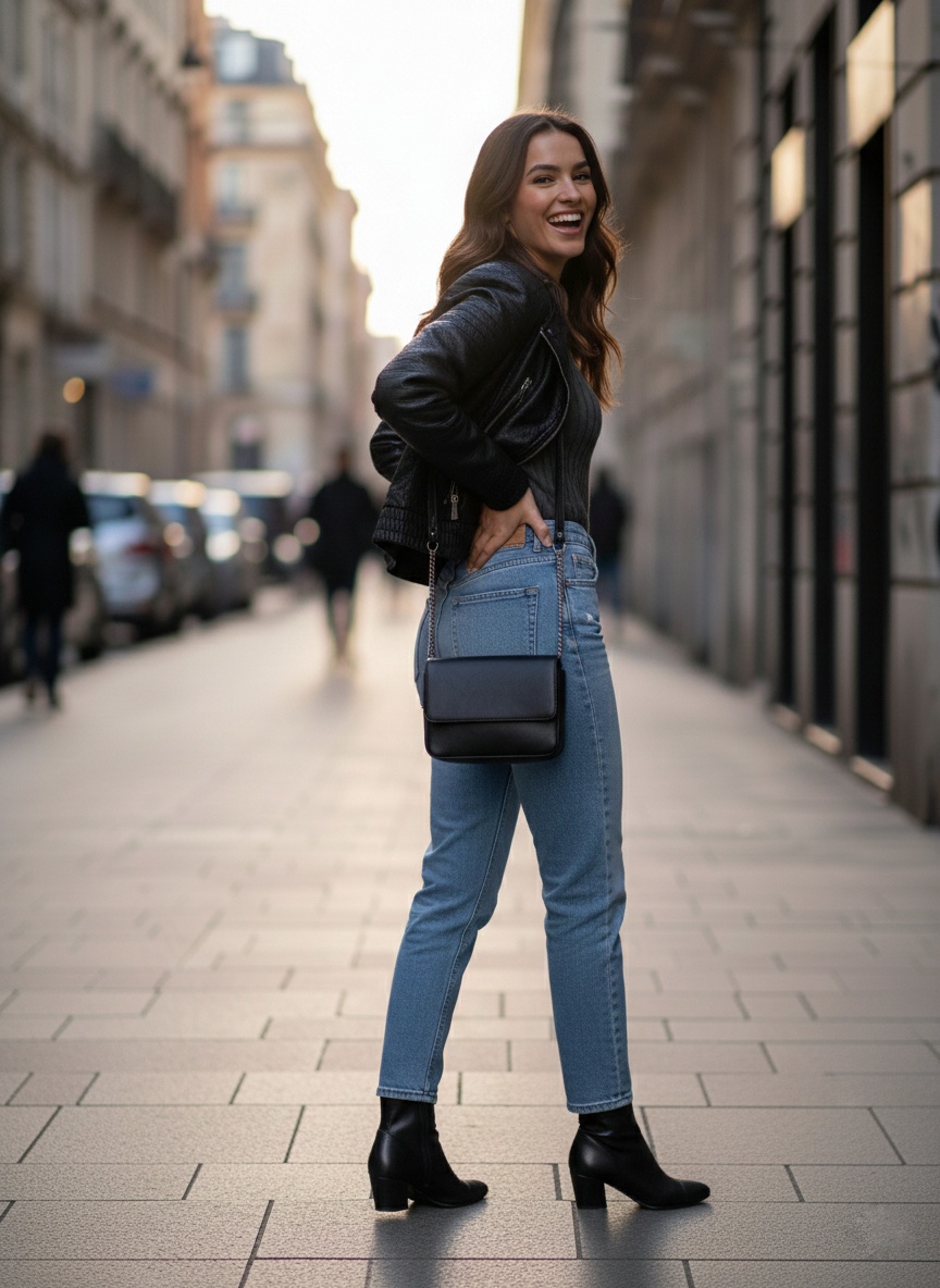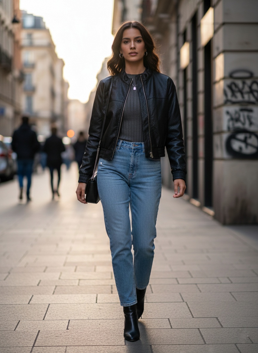 Cazadora de polipiel estilo bomber, el cuello mao le da un toque más moderno. Lleva goma en la parte inferior.