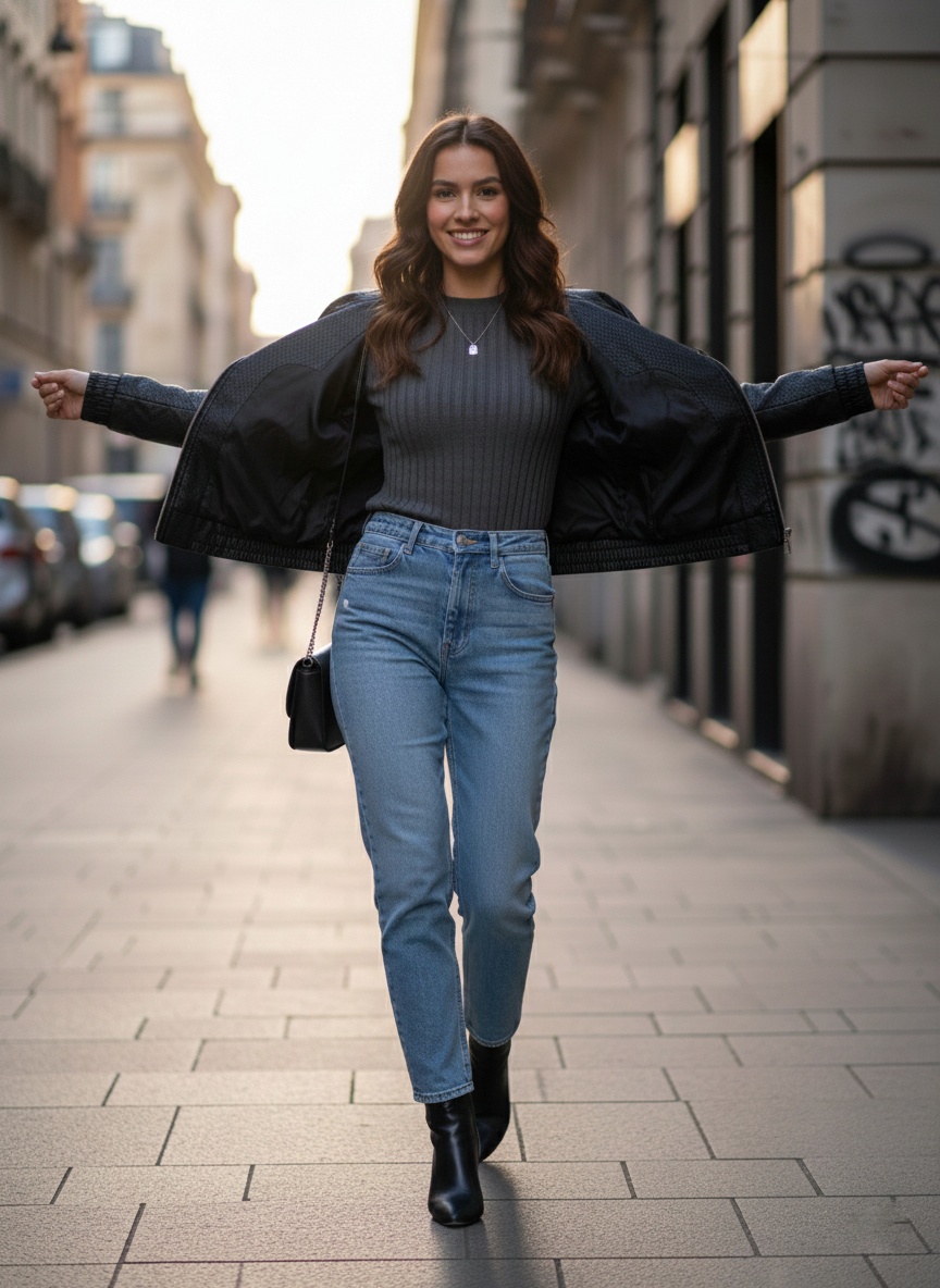 La cazadora tiene cremallera en la parte delantera y dos bolsillos en los laterales.