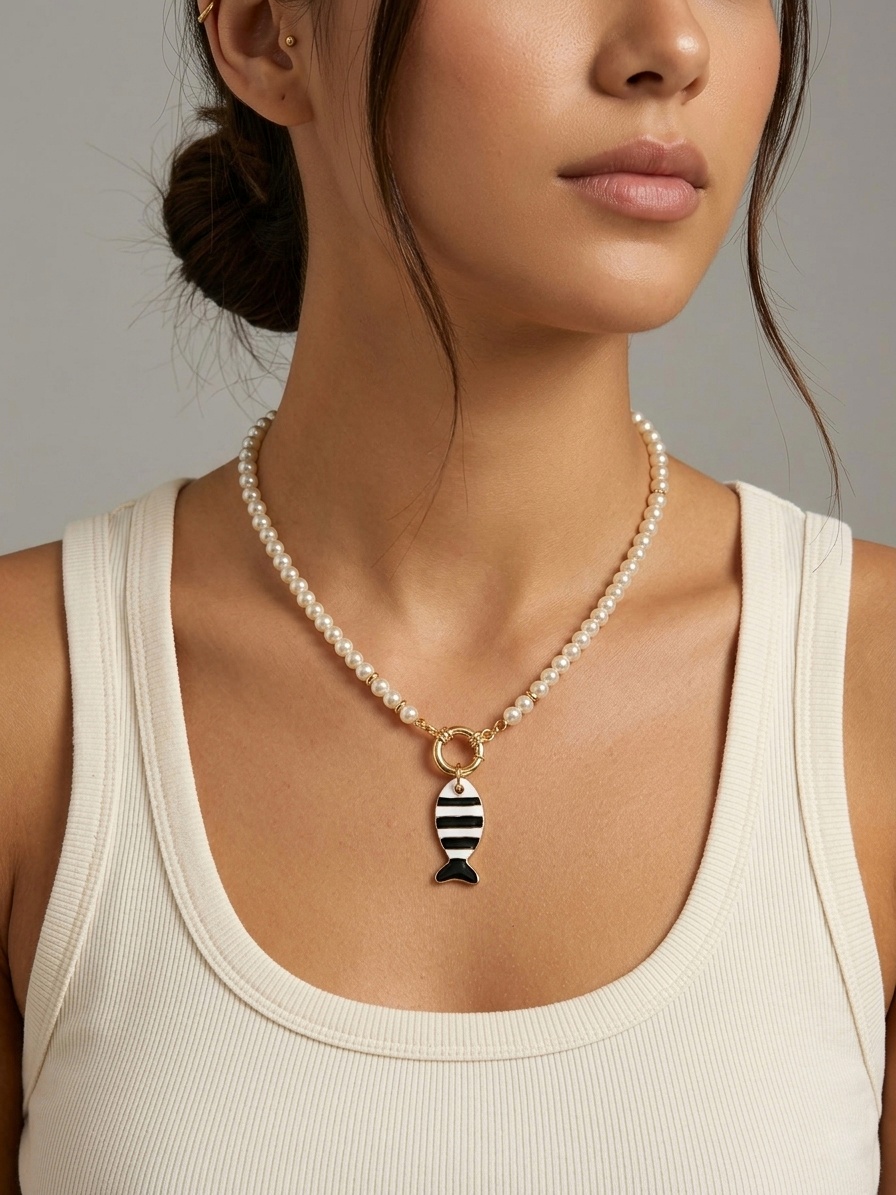 Collar de perlas, cierre marinero de acero, pescadito de colgante.