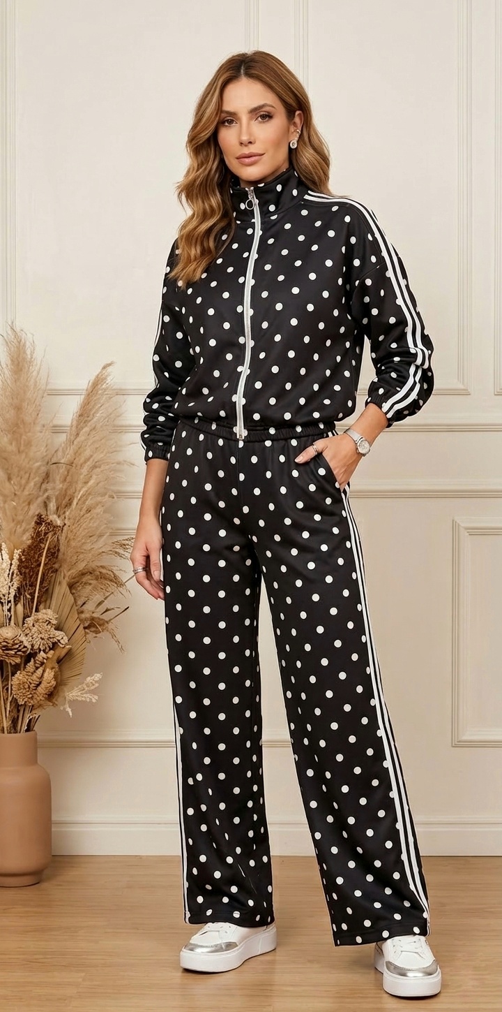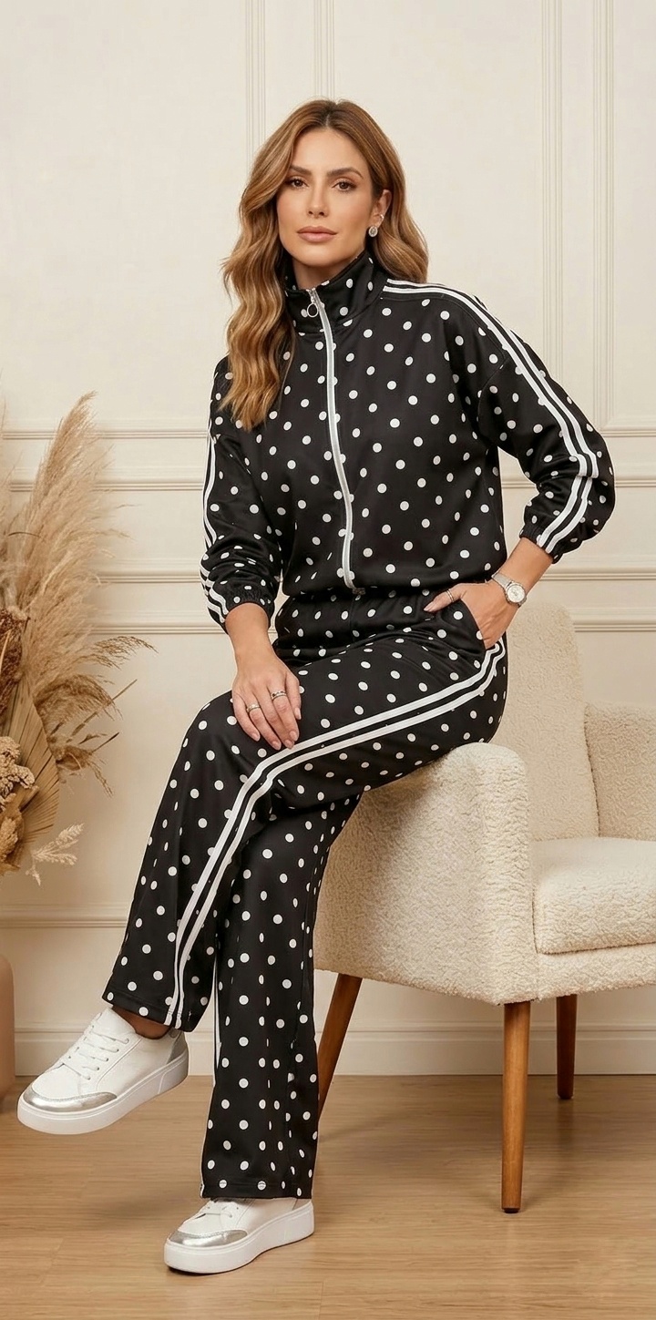 Conjunto de dos piezas estilo chándal. Con chaqueta y pantalón de lunares con dos rayas en color blanco.
