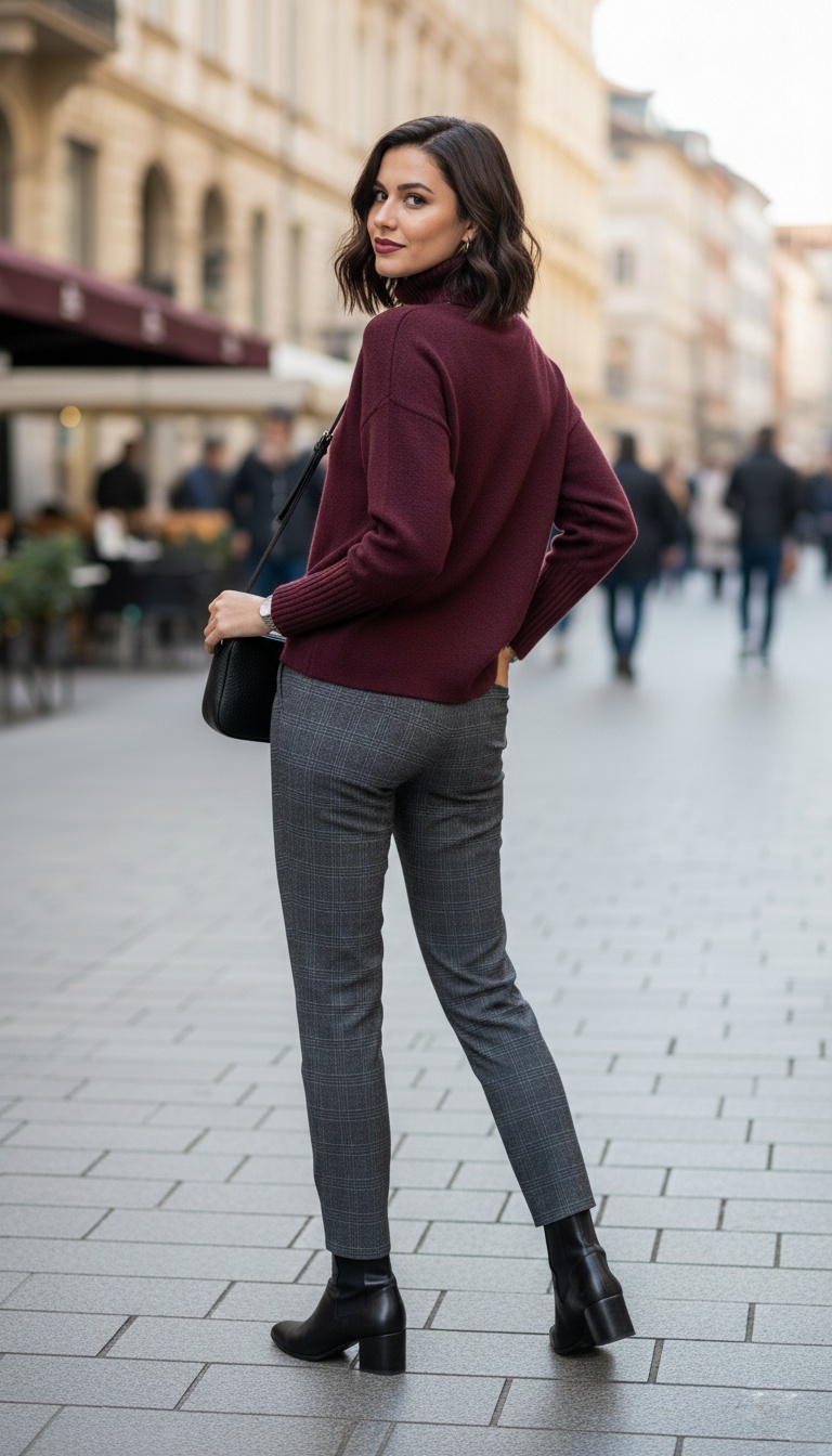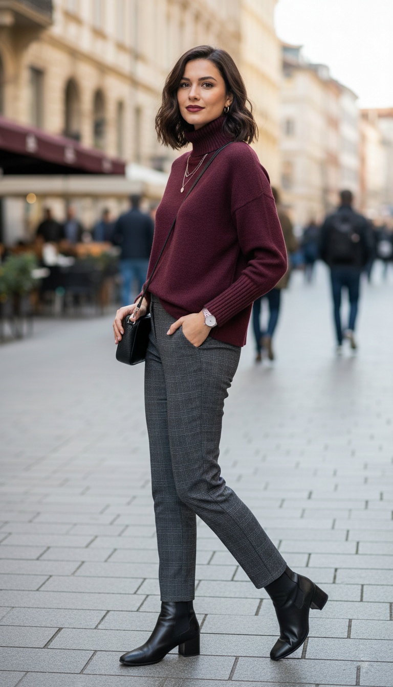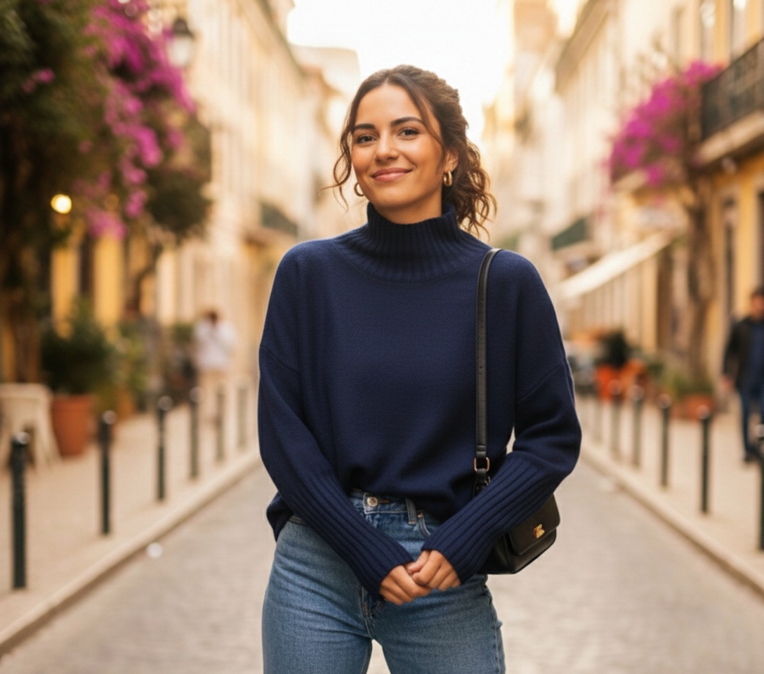 Jersey de punto suave y elástico, cuello chimenea de tejido de punto de canalé, puño alto de tejido de punto de canalé.