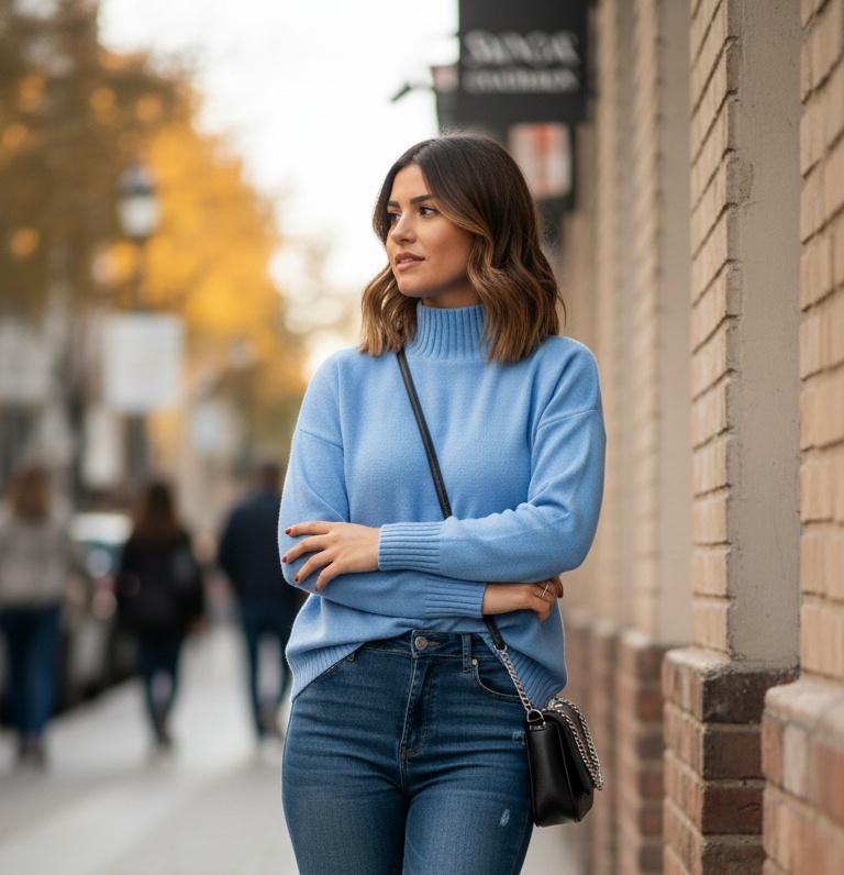 Jersey de punto suave y elástico, cuello chimenea de tejido de punto de canalé, puño alto de tejido de punto de canalé.