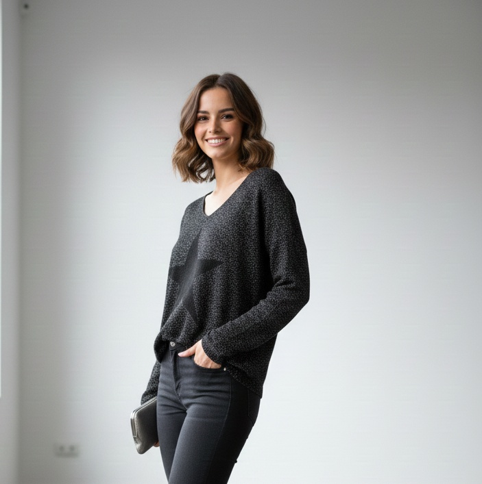 Jersey de punto fino de lurex con una estrella en el pecho, manga larga y cuello pico.