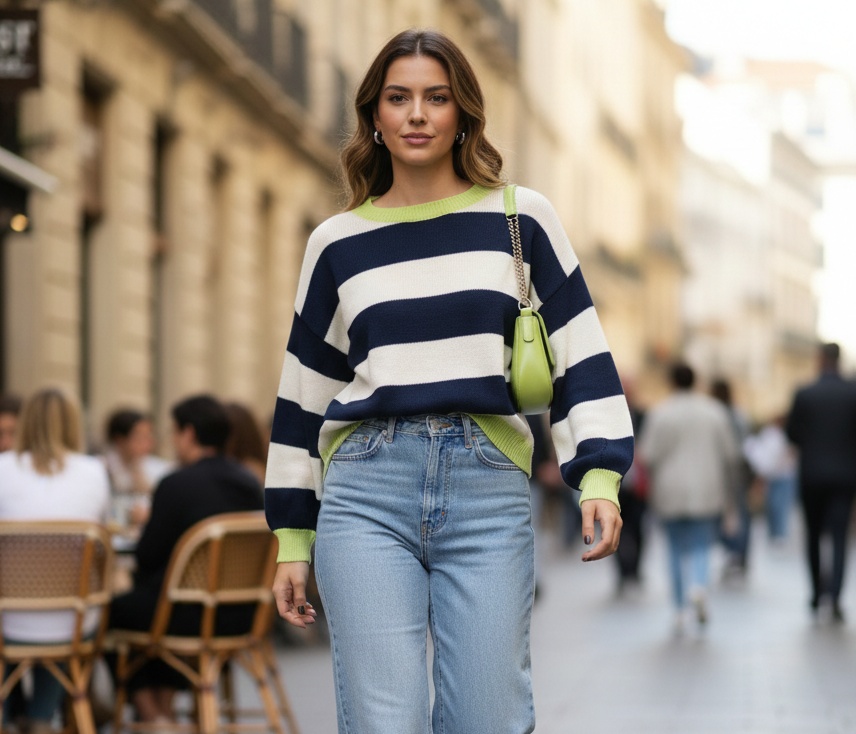 Jersey de punto de algodón en rayas horizontal anchas en tres colores.