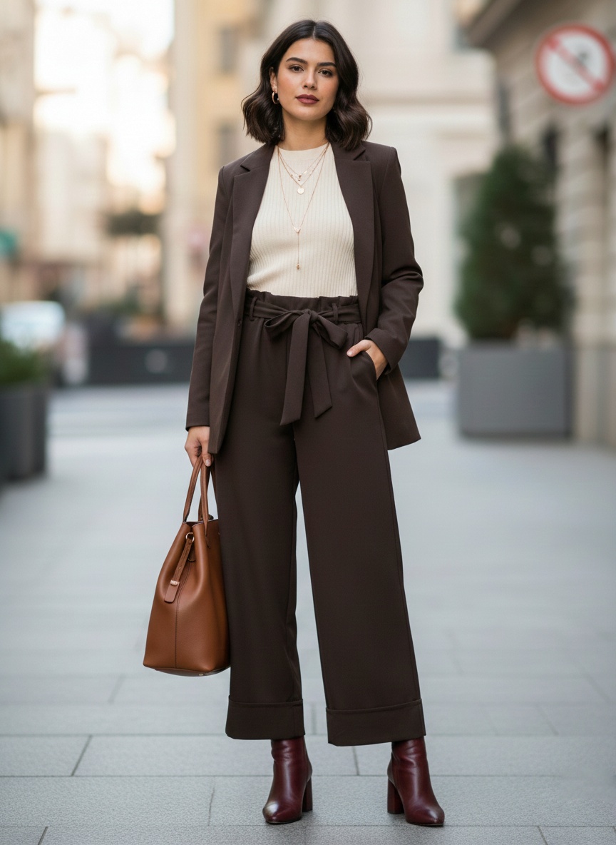 Pantalón ancho con caída recta, lleva un lazo como cinturón, pero se puede quitar sin problema.