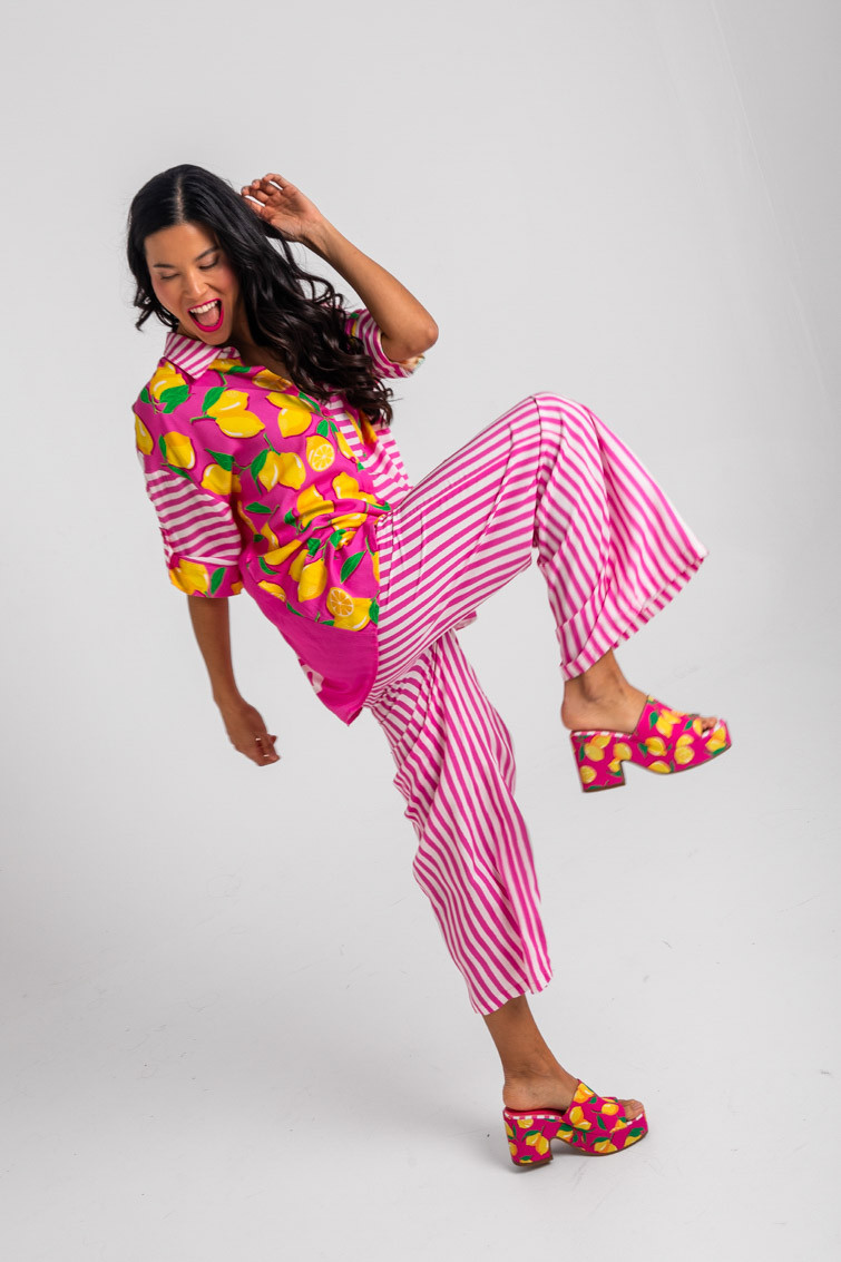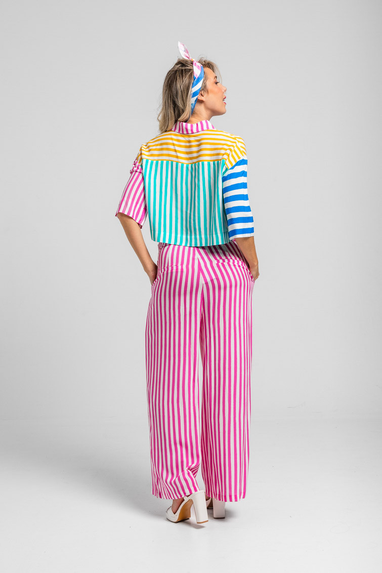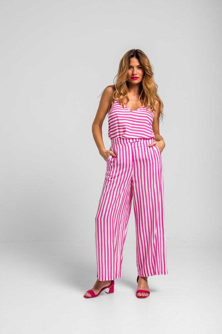 Pantalón culotte de rayas blancas y rosas: Pantalón de tiro alto con bolsillos delanteros, falsos bolsillos en espalda, pernera ancha y cierre frontal con cremallera, botón interior y gancho.