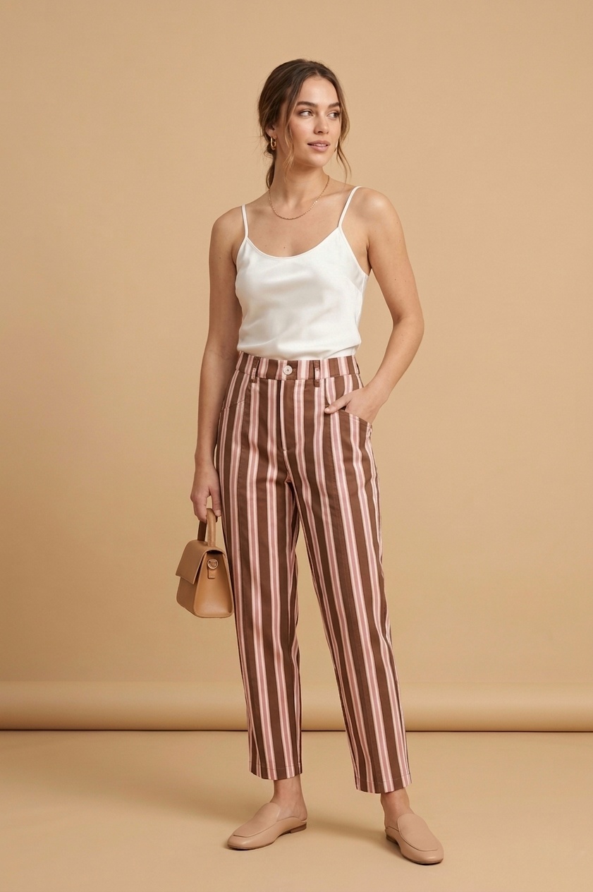 Pantalón de loneta elástica, goma en la parte trasera de la cintura, corte barrel, bolsillos delanteros.
