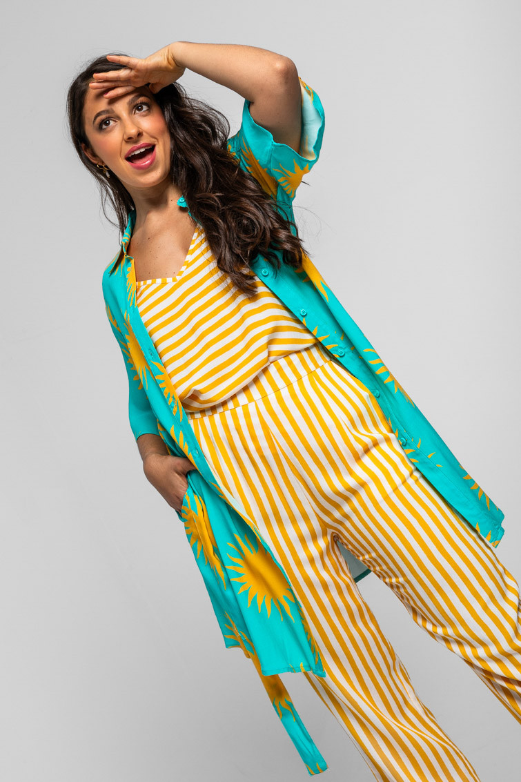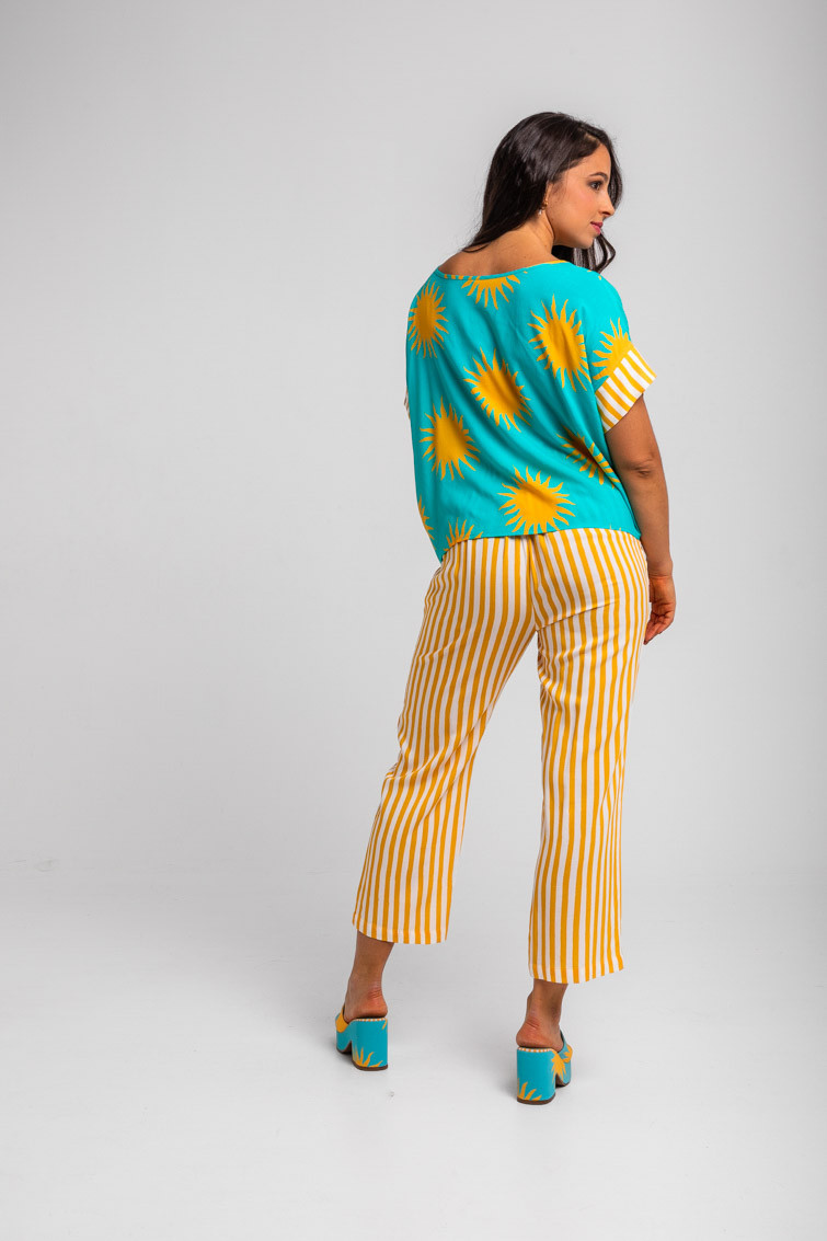 Pantalón culotte de rayas blancas y amarillas: Pantalón fluido de corte pijamero y largo tobillero, goma en cintura trasera con bolsillos laterales a costura invisibles. – 100% Viscosa.