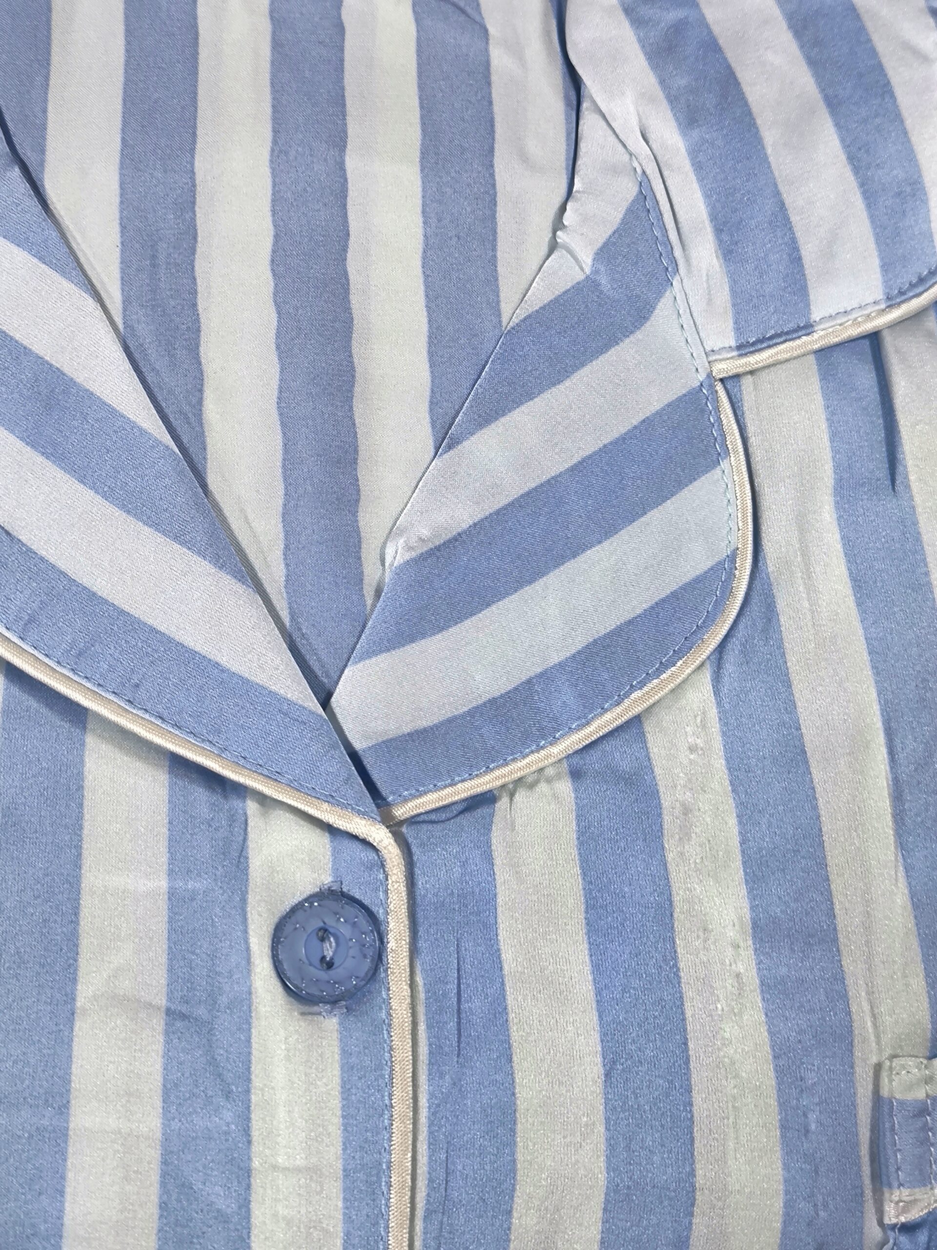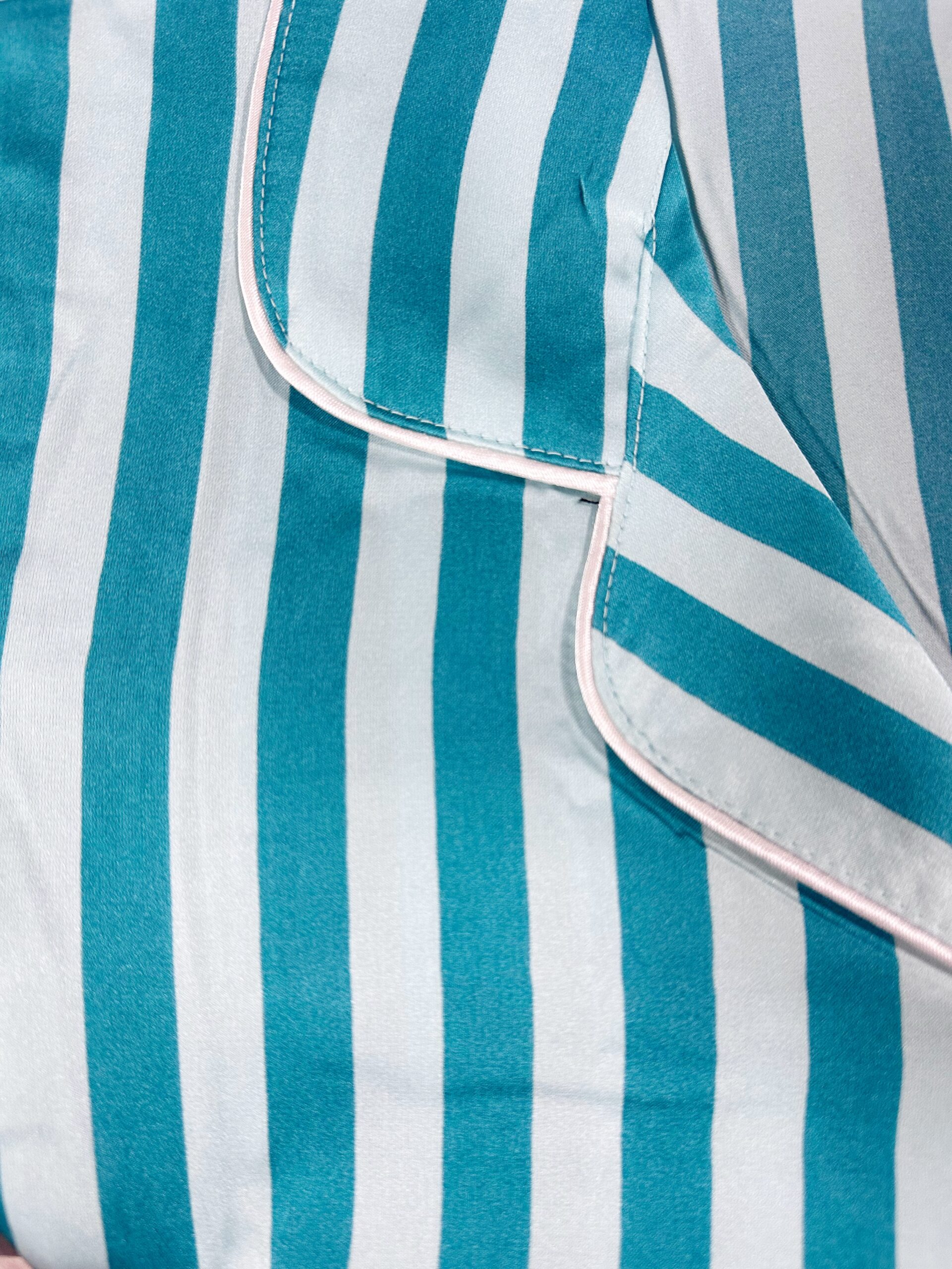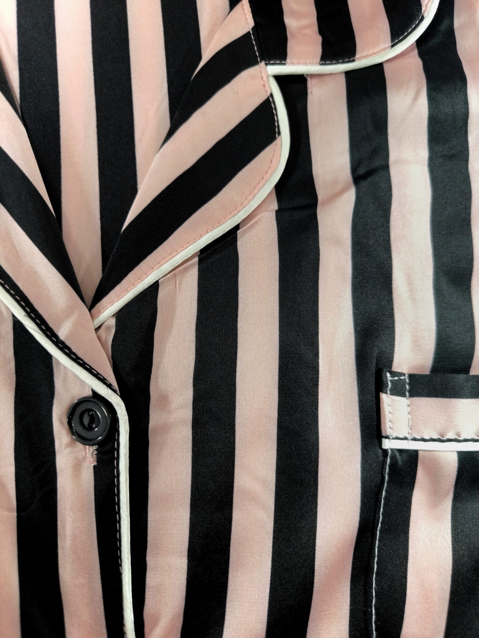Pijama de satén, dos piezas. Camisa con bolsillo y ribete en cuello y puños. Pantalón con goma en la cintura.