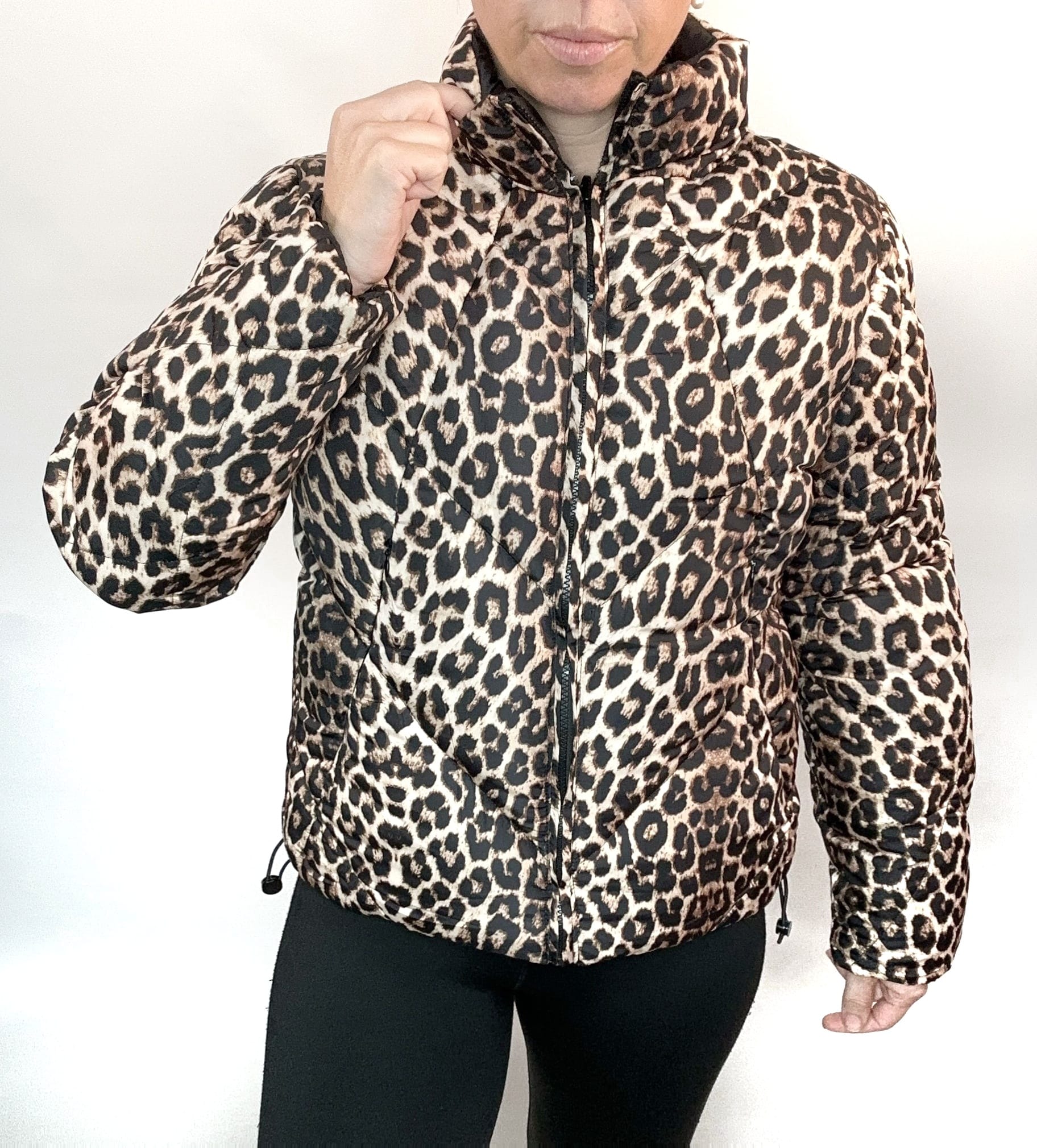 Chaqueta de plumas, reversible. Por una parte leopardo clásico, por la otra, negro básico.