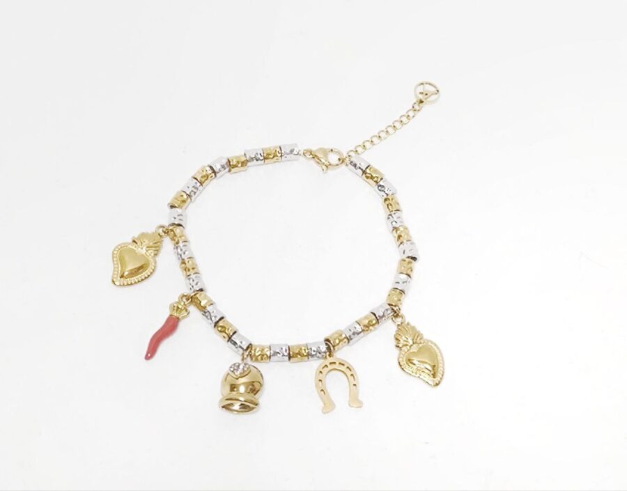 Pulsera de cuentas de acero, charms de corazón sagrado mexicano, ajustable en la muñeca.
