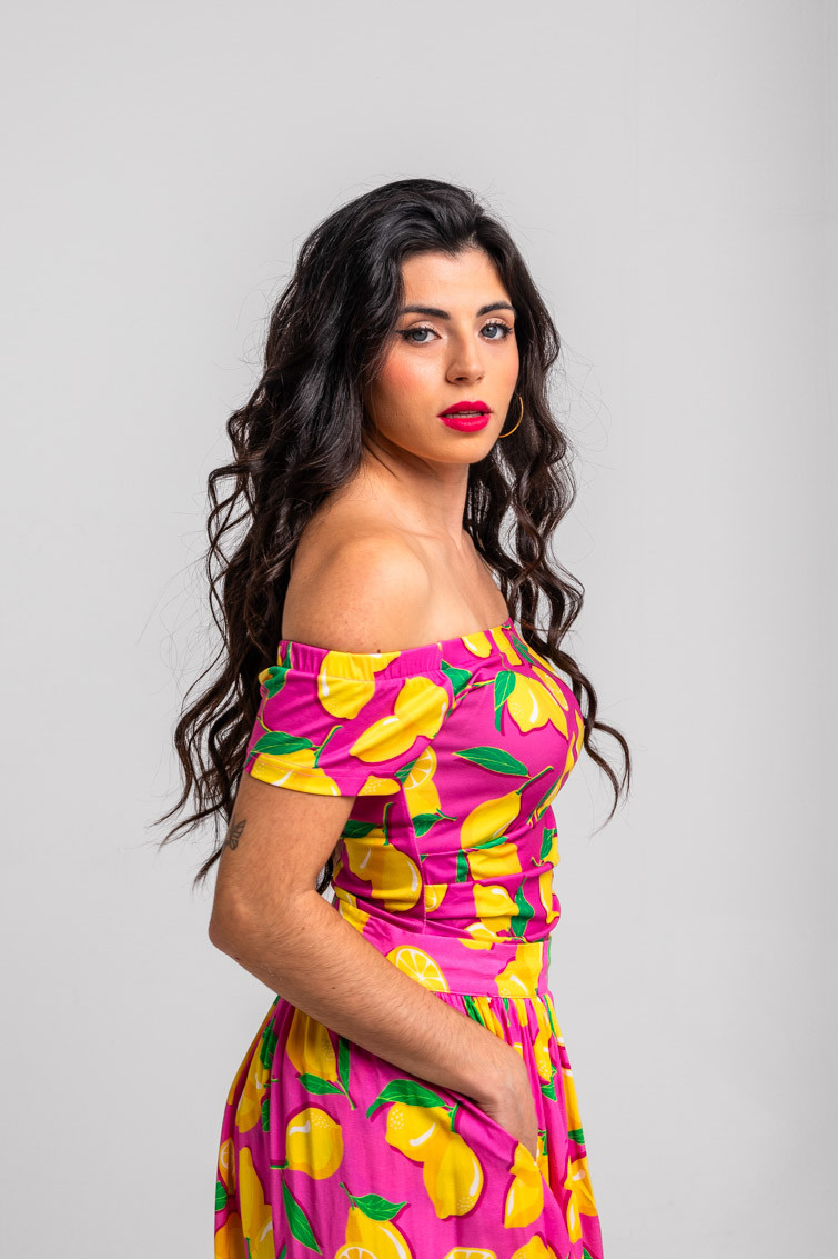Top bardot rosa de limones: Camiseta en tejido elástico de hombros descubiertos en estilo bardot. Diseñada con detalle de drapeado en un laterial y corte cropped.