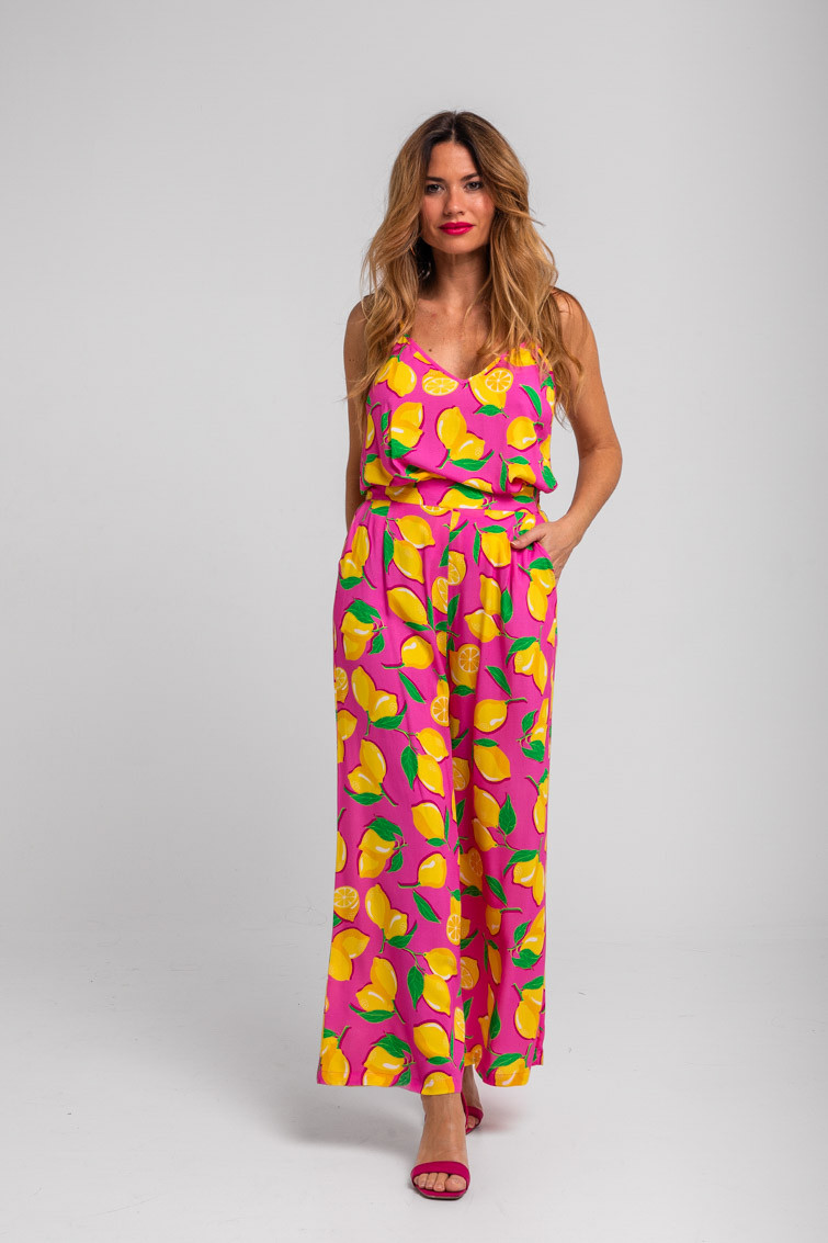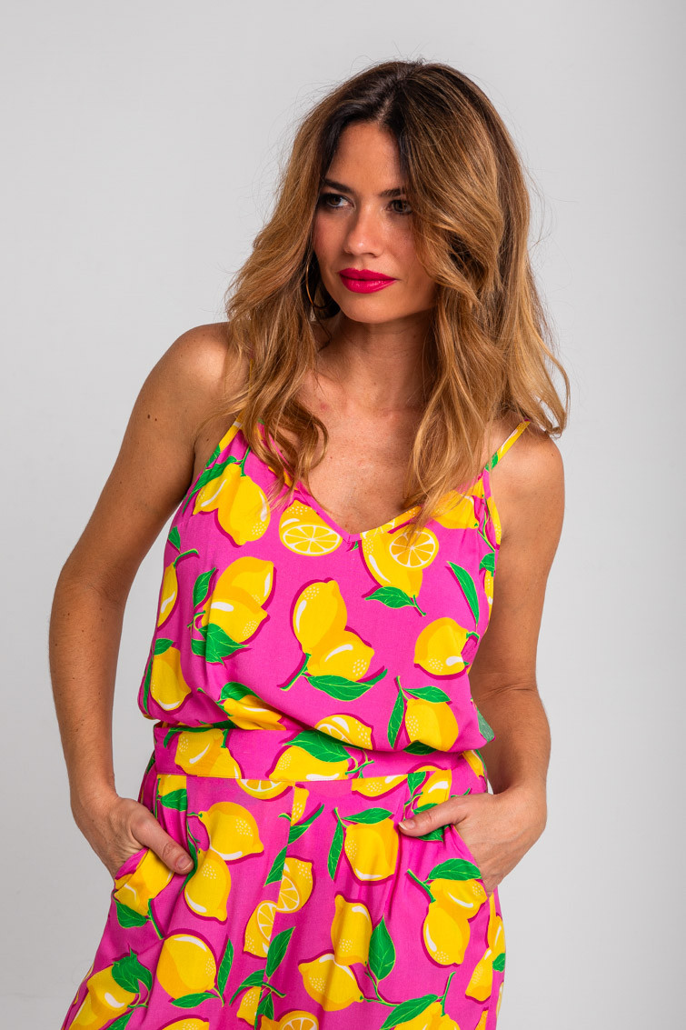 Blusa lencera rosa de limones: Blusa lencera de tejido fluido elástico, encaje en escote y tirantes ajustables.
