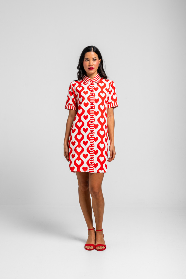 Vestido camisero corto lady de corazones y ondas blanco y rojo: Vestido de silueta recta con botonadura completa al frente. Cuenta con cuello de camisa, manga corta con vuelta y un corte limpio.