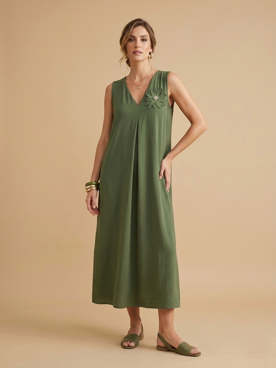 Vestido fresquito, escote pico, sin mangas, tejido con caída que no se pega al cuerpo. Detalle de broche en forma de flor y strass.