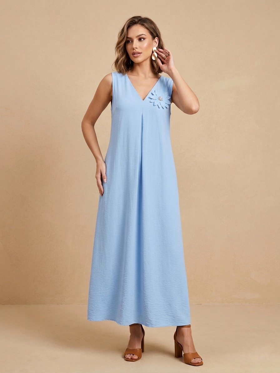 Vestido fresquito, escote pico, sin mangas, tejido con caída que no se pega al cuerpo. Detalle de broche en forma de flor y strass.