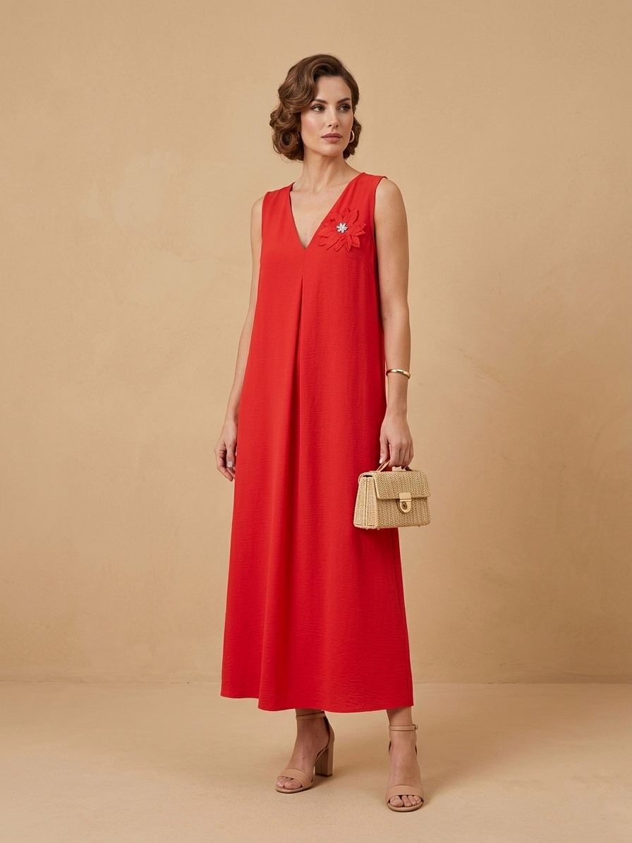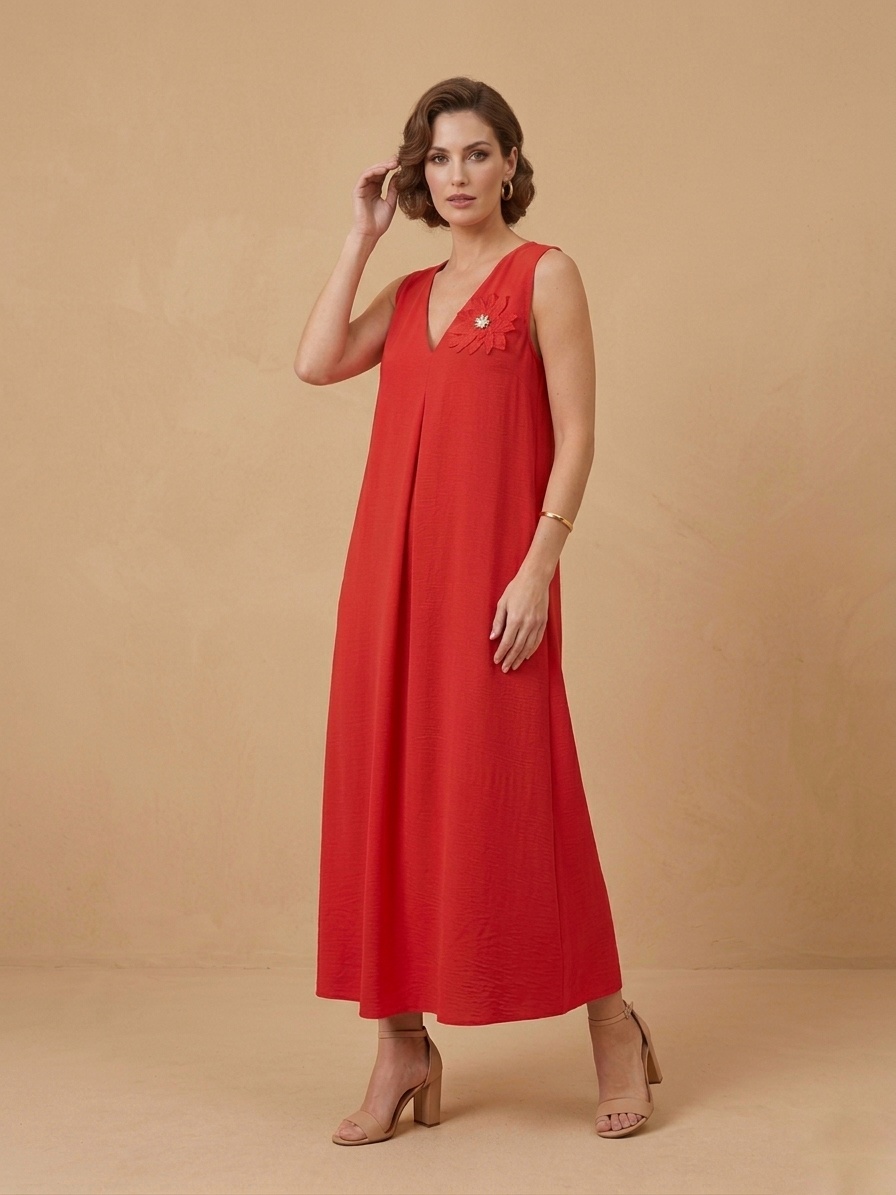 Vestido fresquito, escote pico, sin mangas, tejido con caída que no se pega al cuerpo. Detalle de broche en forma de flor y strass.