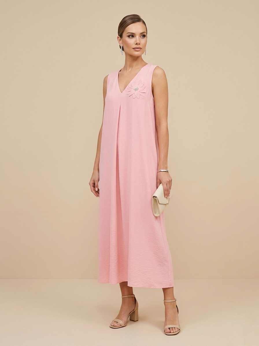 Vestido fresquito, escote pico, sin mangas, tejido con caída que no se pega al cuerpo. Detalle de broche en forma de flor y strass.