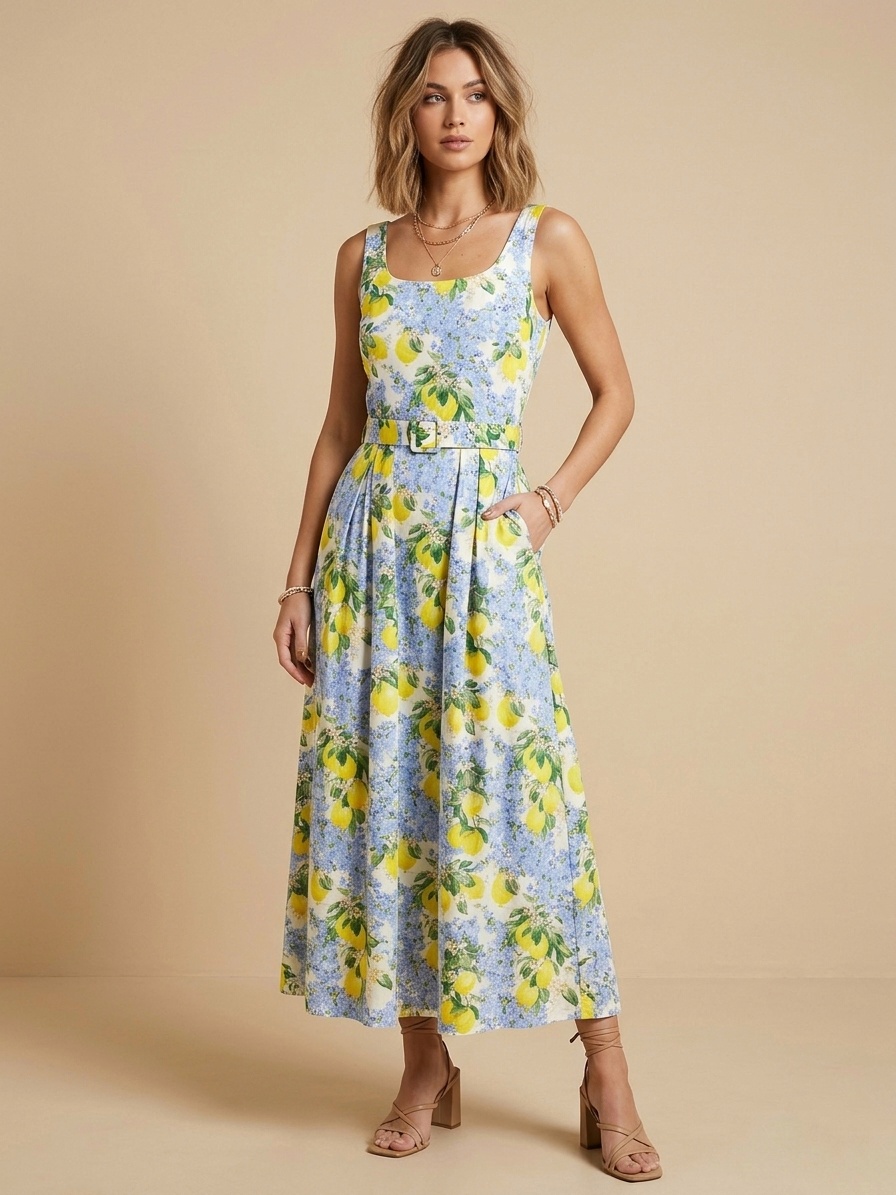 Vestido midi con tirante ancho, perfecto para poder llevar sujetador y con el escote cuadrado. Tiene el detalle del cinturón ajustable con la misma tela que el vestido,