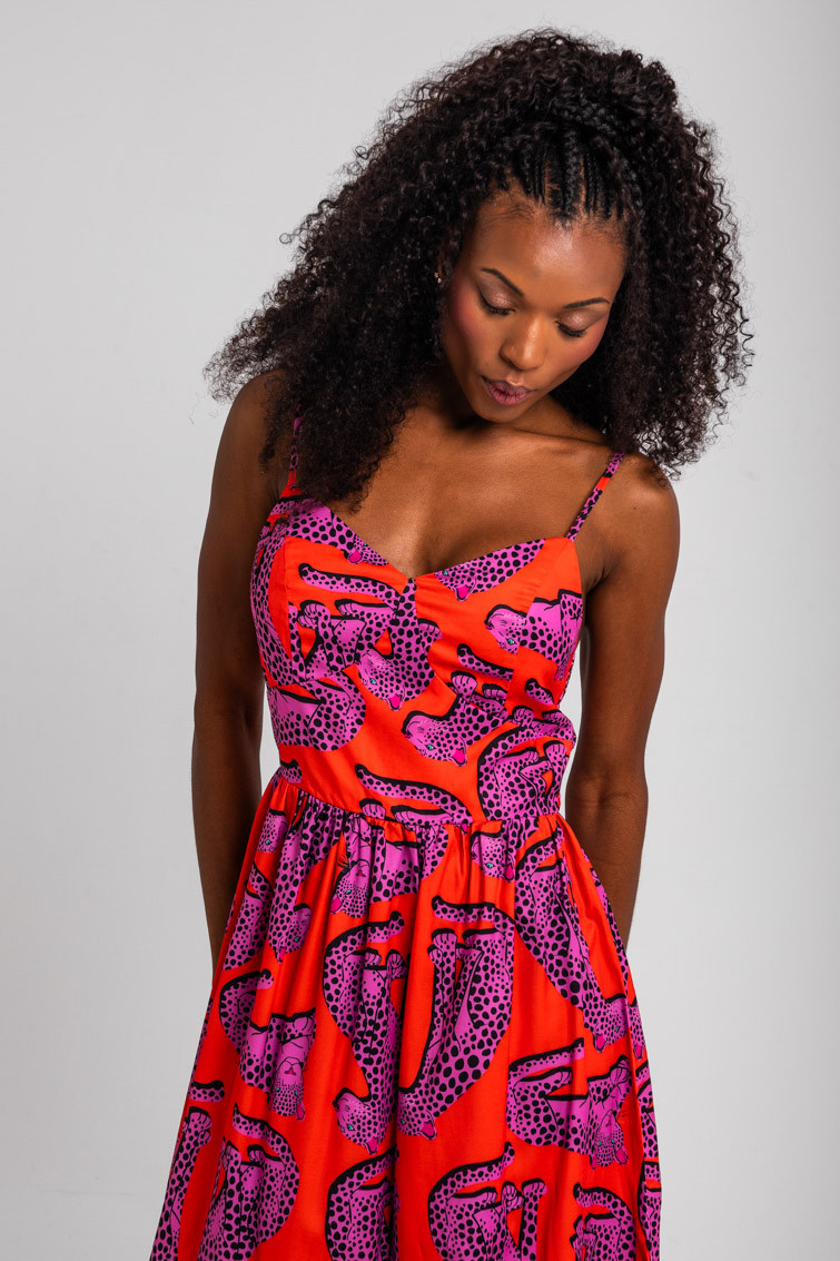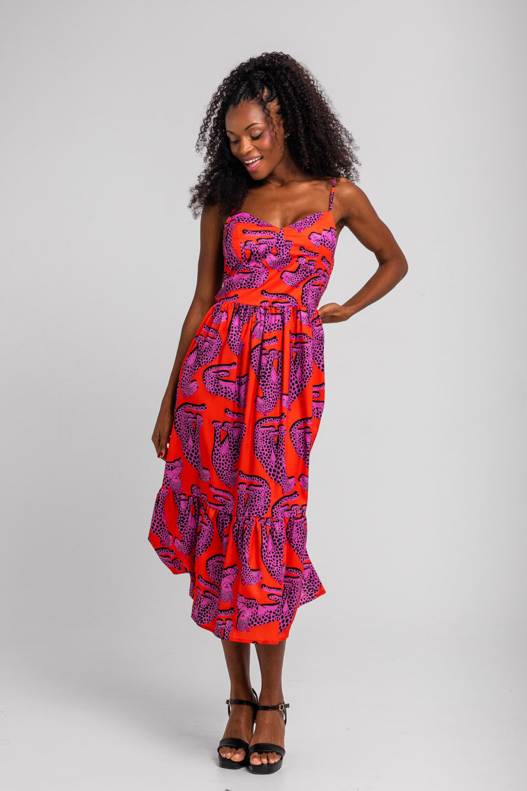 Vestido midi bustier naranja y panteras rosas: Vestido midi en tejido fluido de tirantes finos espagueti. Cuerpo tipo bustier con cortes en copa y costadillos que aportan estructura. Cintura definida y falda fluida con volante ancho fruncido en el bajo. – 100% Poliéster.