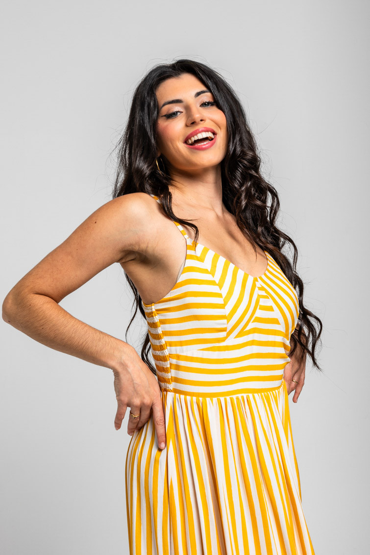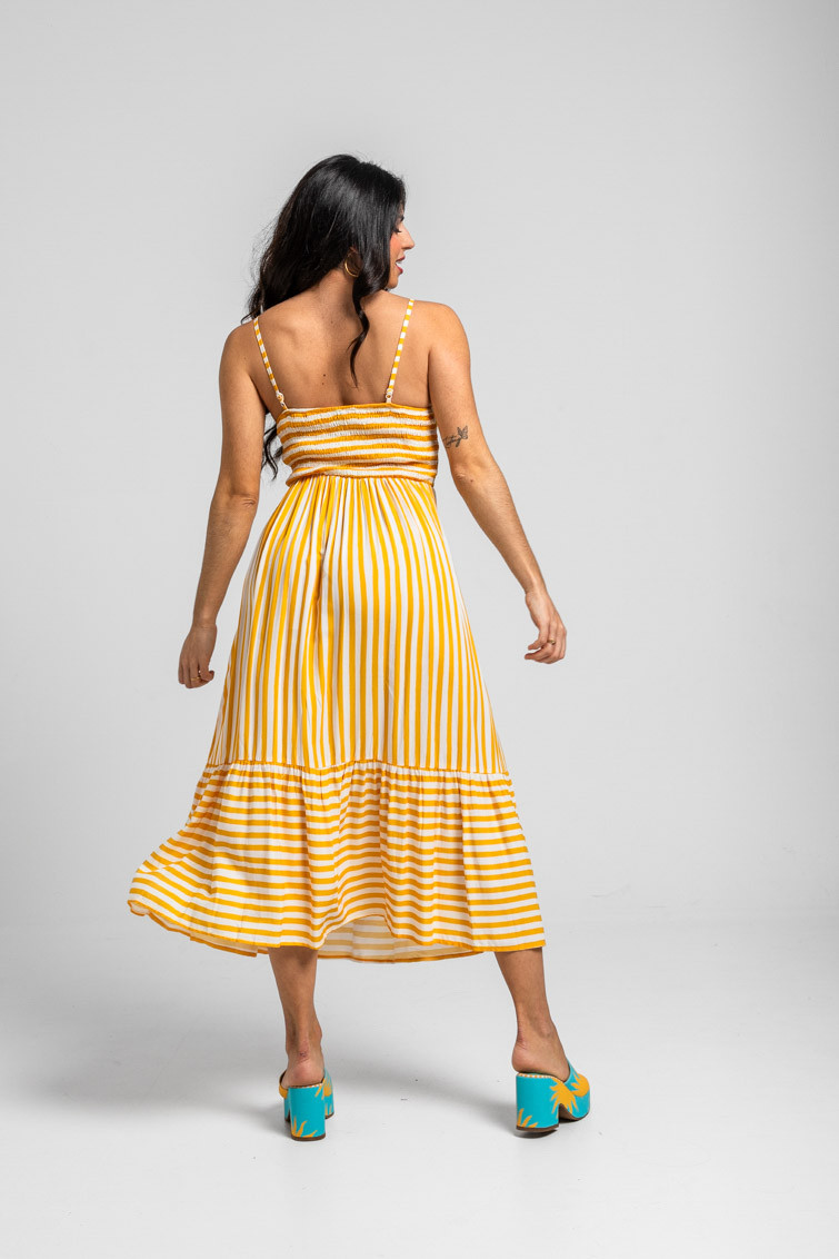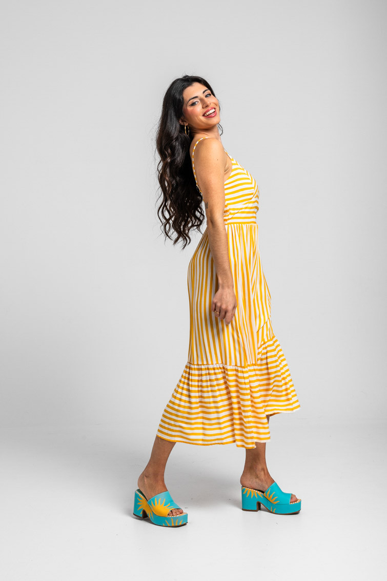Vestido midi en tejido fluido de tirantes finos espagueti. Cuerpo tipo bustier con cortes en copa y costadillos que aportan estructura. Cintura definida y falda fluida con volante ancho fruncido en el bajo. – 100% Viscosa.