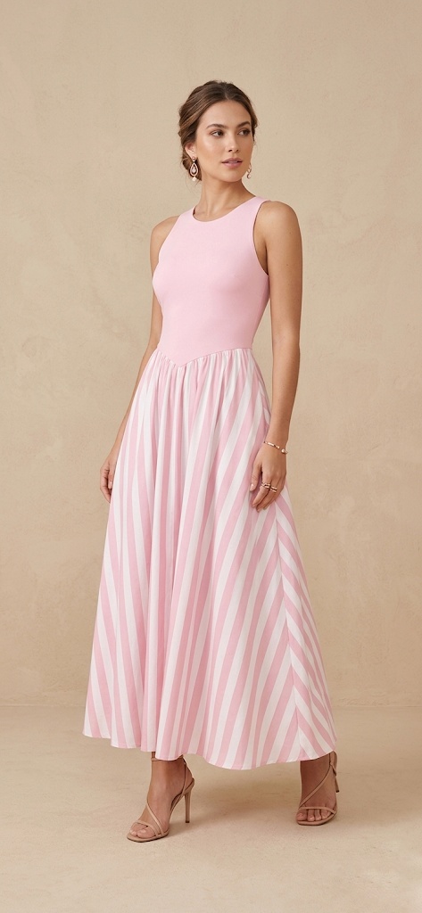 El corpiño del vestido tiene el cuello redondo y sin mangas. La falda es larga, con un patrón de rayas verticales.